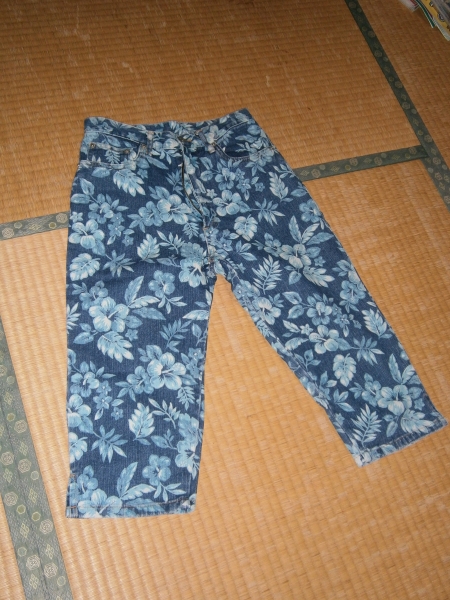 花柄デニム ハーフパンツ<W61>USED 普段着として着用していた使用感のある中古のお品です。 USED品とご理解の程よろしくお願いいたします。 着丈66cm |