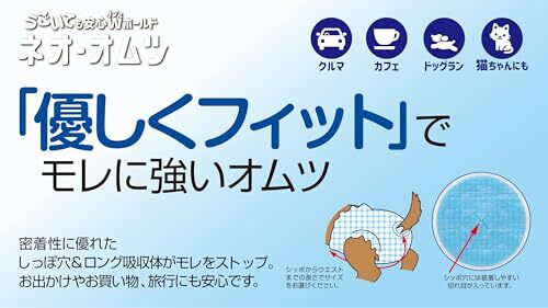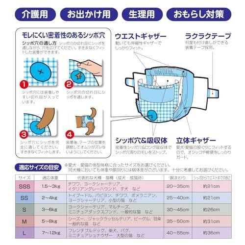 商品紹介 動いても安心W(ダブル)ホールド。介護用・お出かけ用・生理用・おもらし対策etc・・・快適な生活に! ! ぴたっと密着しっぽ穴でモレ安心! しっかり超吸収ガードで長時間安心! 車、カフェ、室内ドッグランや、猫ちゃんにもご使用いただけます。 胴周り: 40~55cm、適応体重: 7~12kg、しっぽからウエストまでの長さ: 36cm、代表的な犬種・猫種(成犬・成猫時):フレンチブルドッグ、柴犬、パグ、ミニチュアシュナウザー、大型の猫 など 使用上の注意 愛犬・愛猫の体型体格に合ったサイズをお選びください。 原材料・成分 ポリオレフィン不織布 ポリエチレン ポリエステル不織布(表面材) 綿状パルプ 吸水紙 高分子吸収材(吸収材)ポリエチレンフィルム(防水材) 粘着テープ(止着材)ポリウレタン(伸縮材) ホットメルト粘着材(結合材)