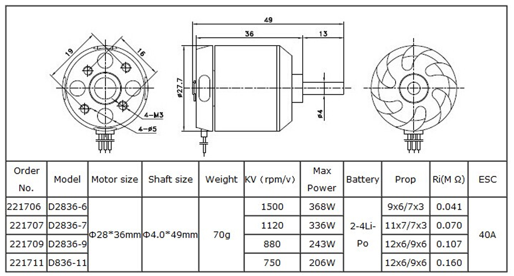 小型電動プレーン/グライダー等向け D2836 1120KV ブラシレスモーター