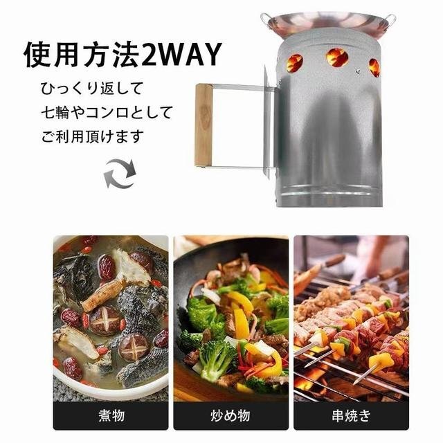 サイズ:掲載サイズ表をご参照ください。 材質:本体/亜鉛めっき鋼板、目皿/鉄(亜鉛めっき)、ハンドル/天然木 煙突効果で簡単に着火可能です。面倒な炭火起こしが楽々です。 ひっくり返したら,コンロや七輪などご利用頂けます。