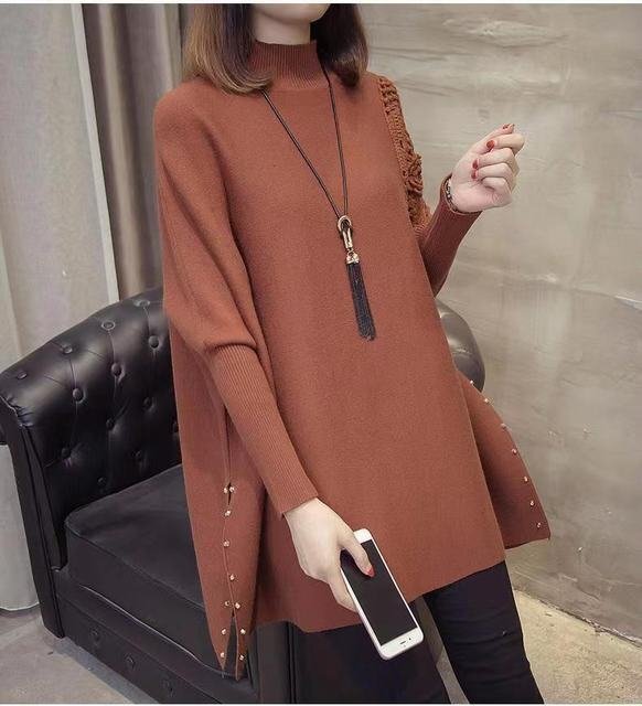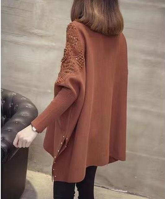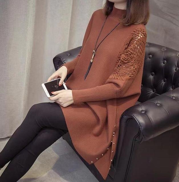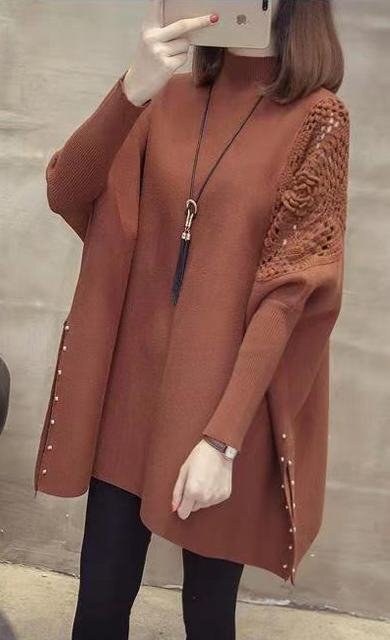 ニット セーター 長袖 秋冬 チュニック レディース トップス 大きいサイズ 袖コンシャス レース パフスリーブ カラメル