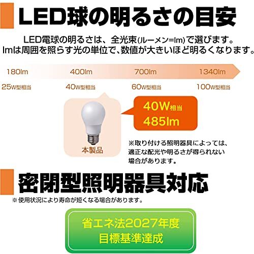 | 商品説明 | 密閉型器具対応 省エネ法2027年度目標基準達成 軽量・コンパクト設計 ワイドに明るい広配光設計です。 白熱電球に近いサイズなので、様々な器具への取り換えが可能です