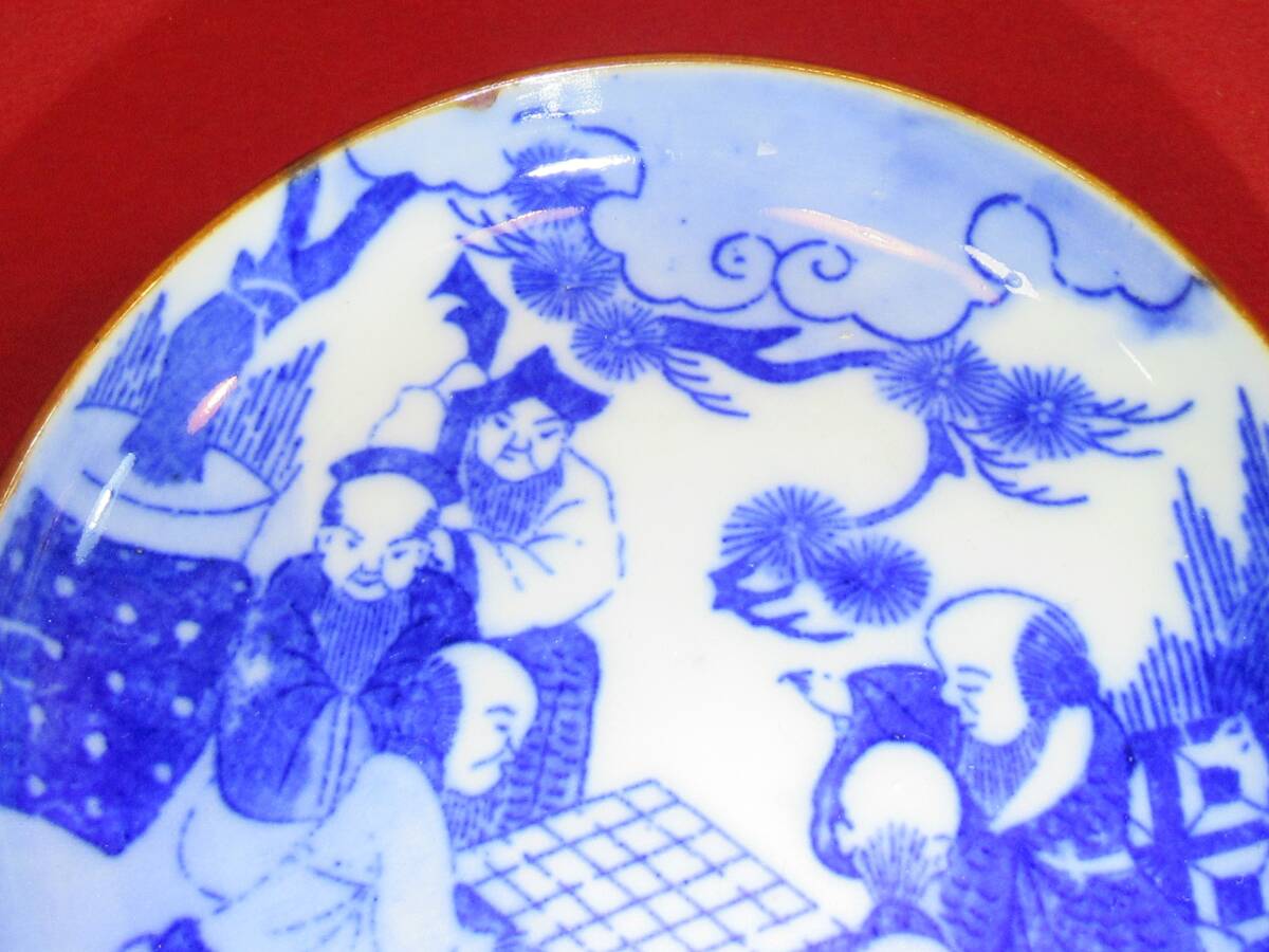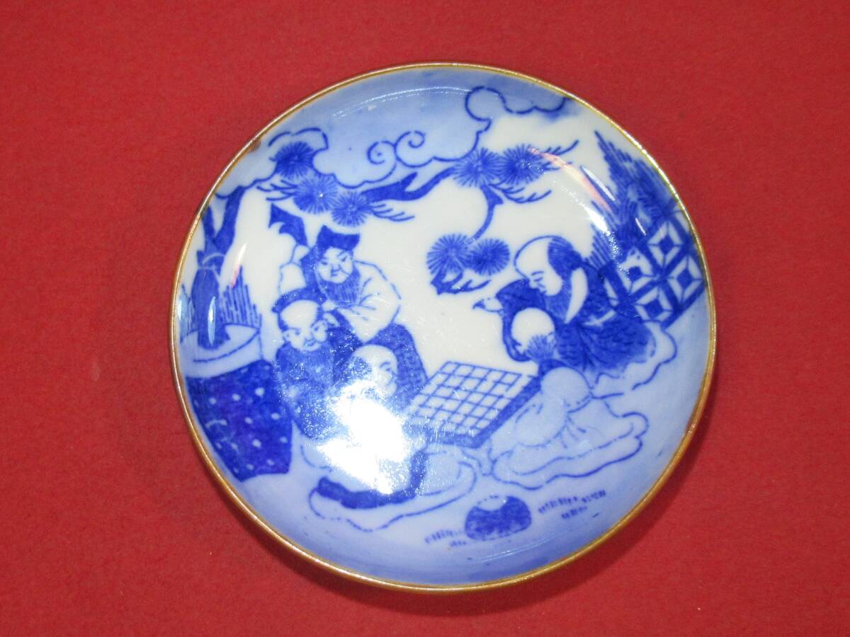 図変り印判『古伊万里染付印判松下囲碁人物文小皿① (径12,7㎝)』明治期 豆皿 銘々皿 コレクター放出品