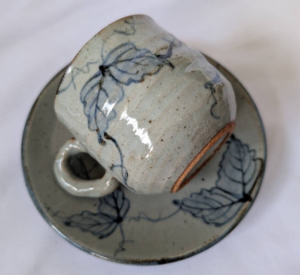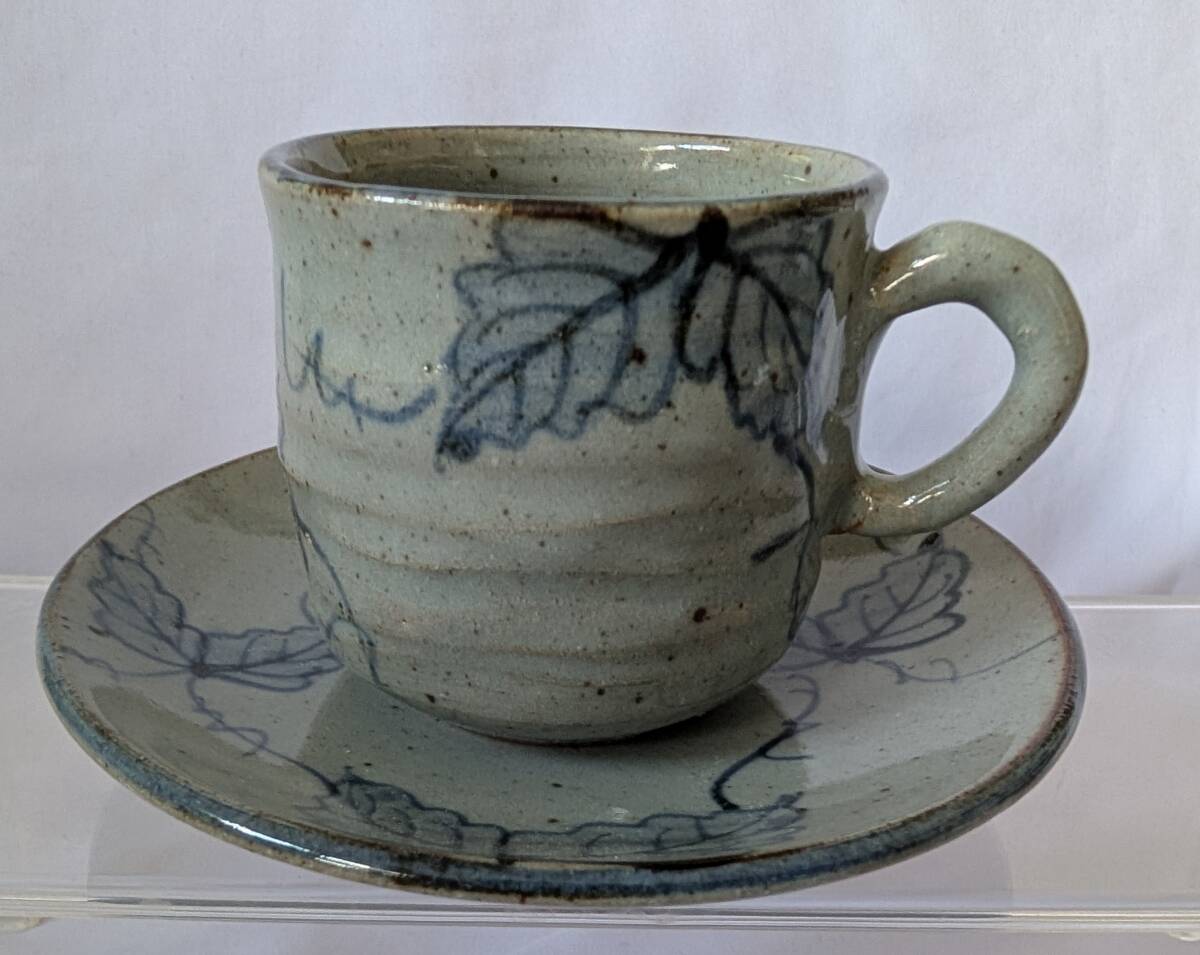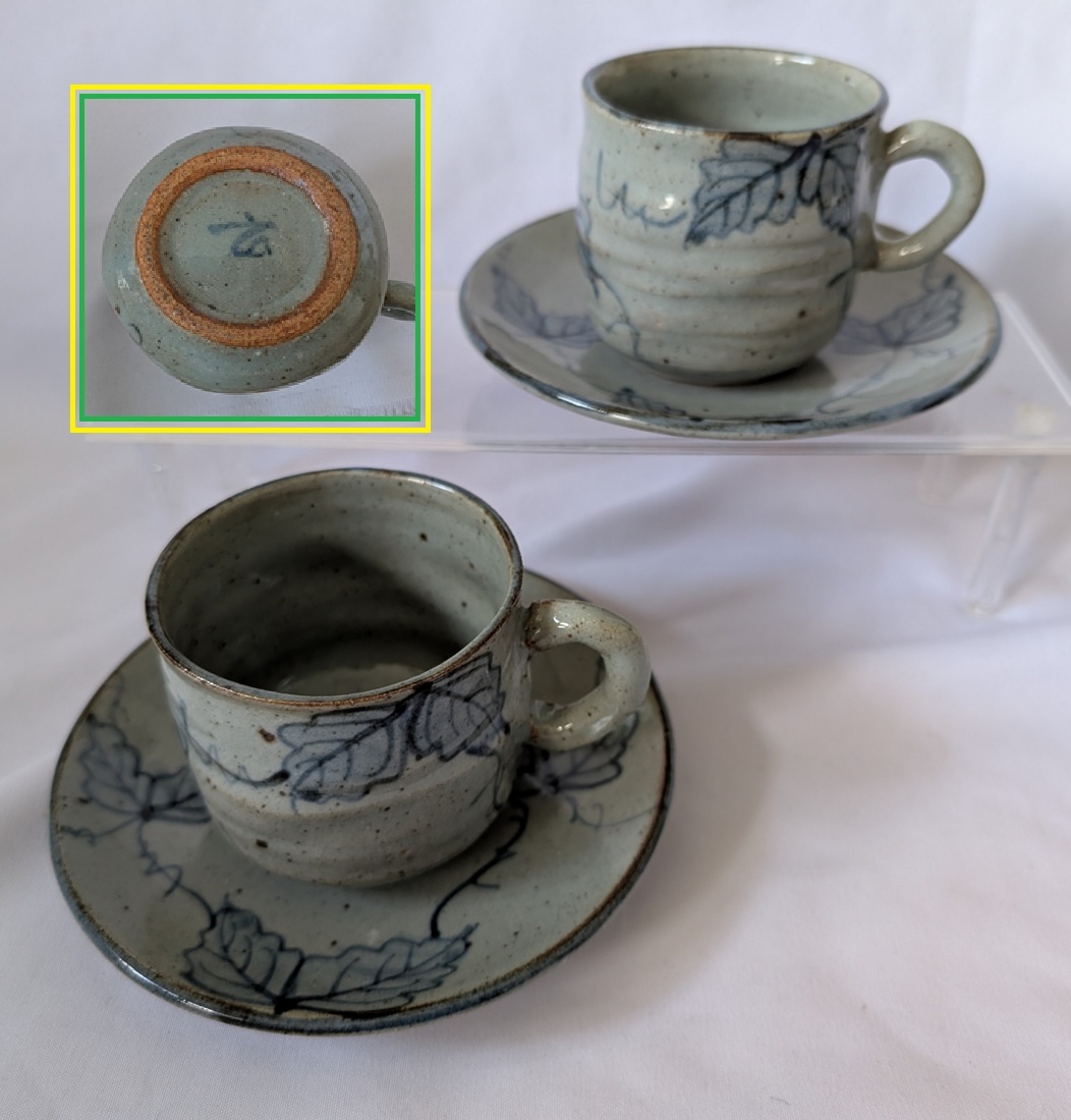 即決可 蔦柄 カップ&ソーサー 2客 ペアカップ 作家名有「玄」  *ツタ柄