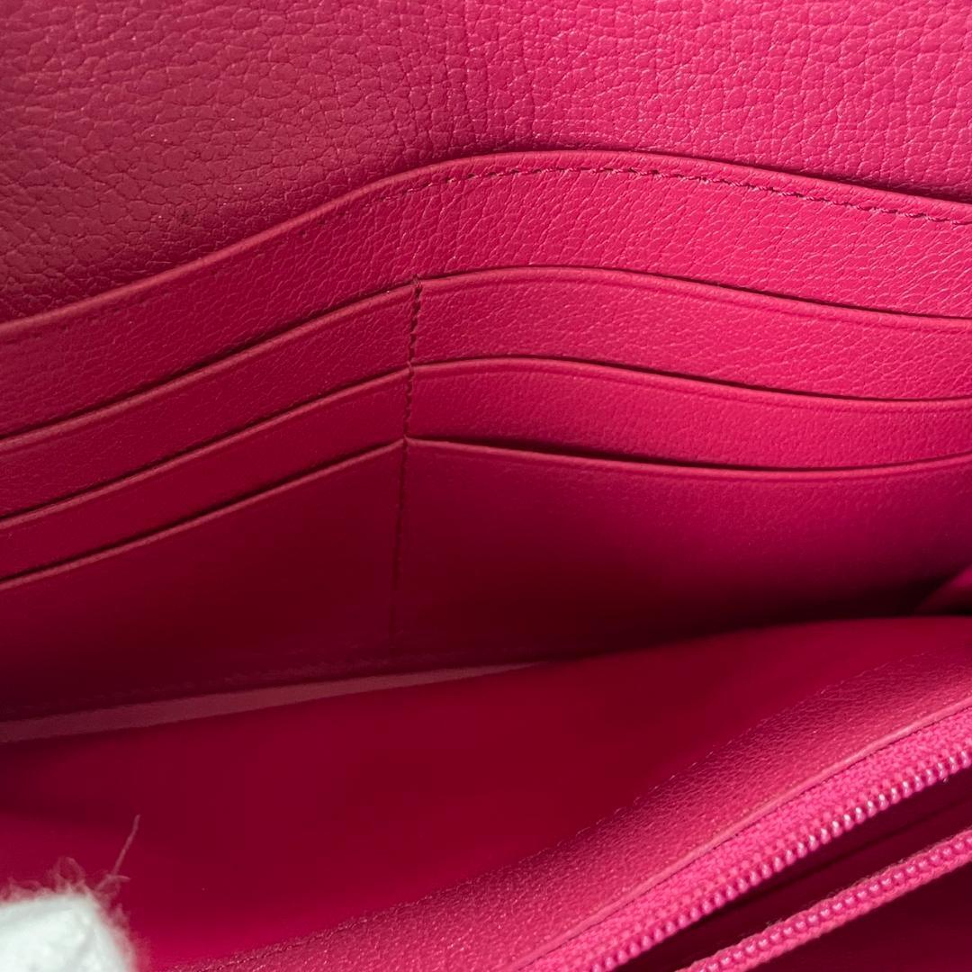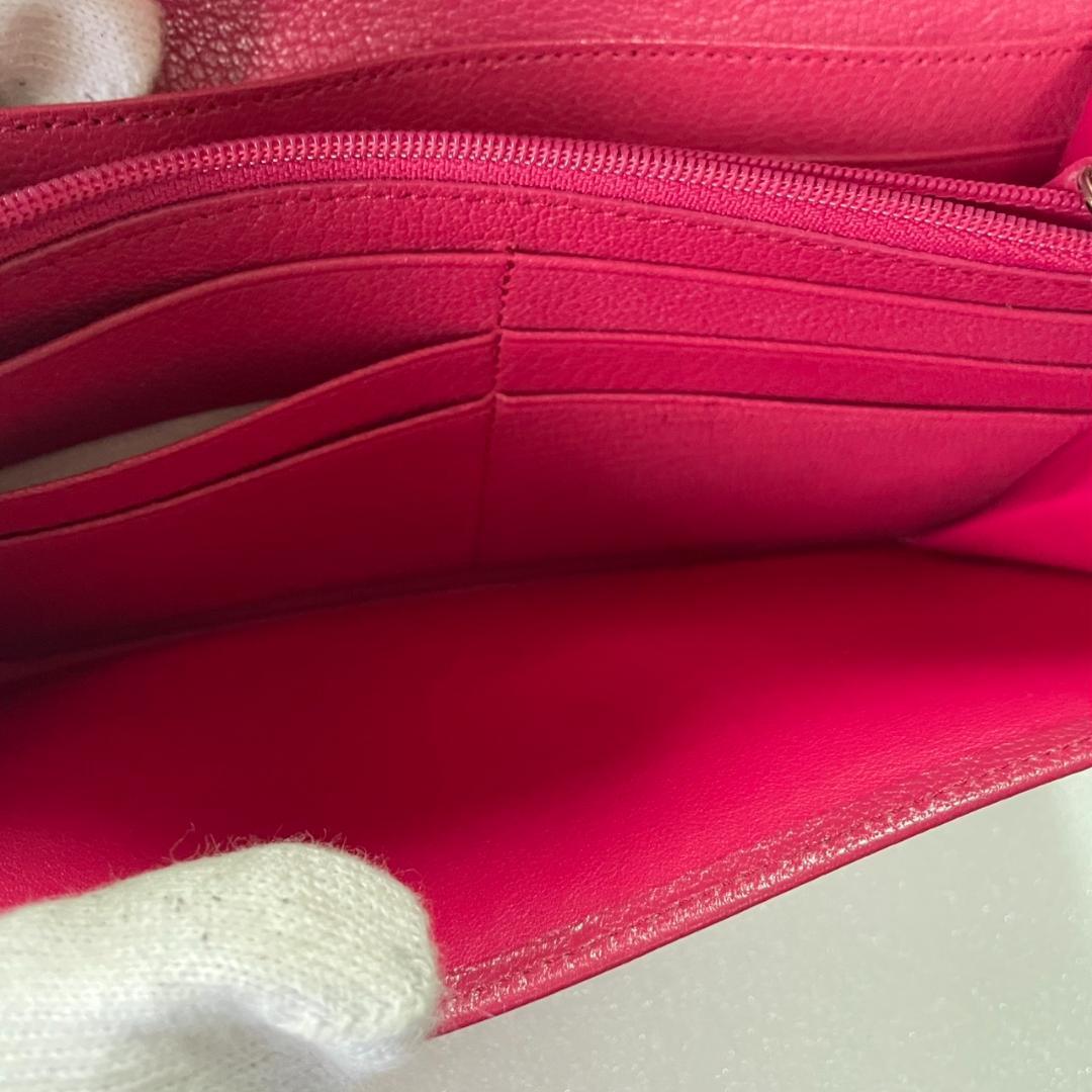 ピンクのレザー製で、カードポケットを備えたフラップ式財布です。