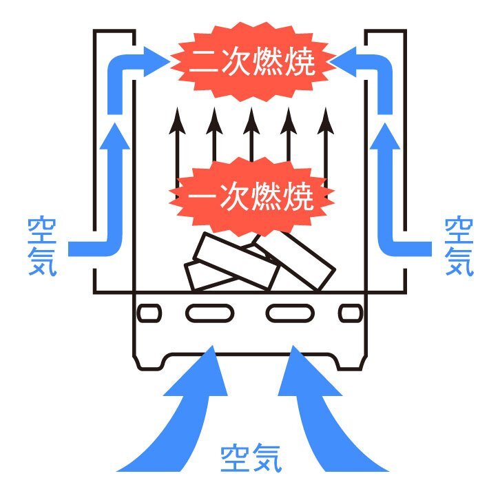燃焼効率抜群、煙やにおいが出にくく、燃え残りが少ない二次燃焼構造のコンパクトストーブ。