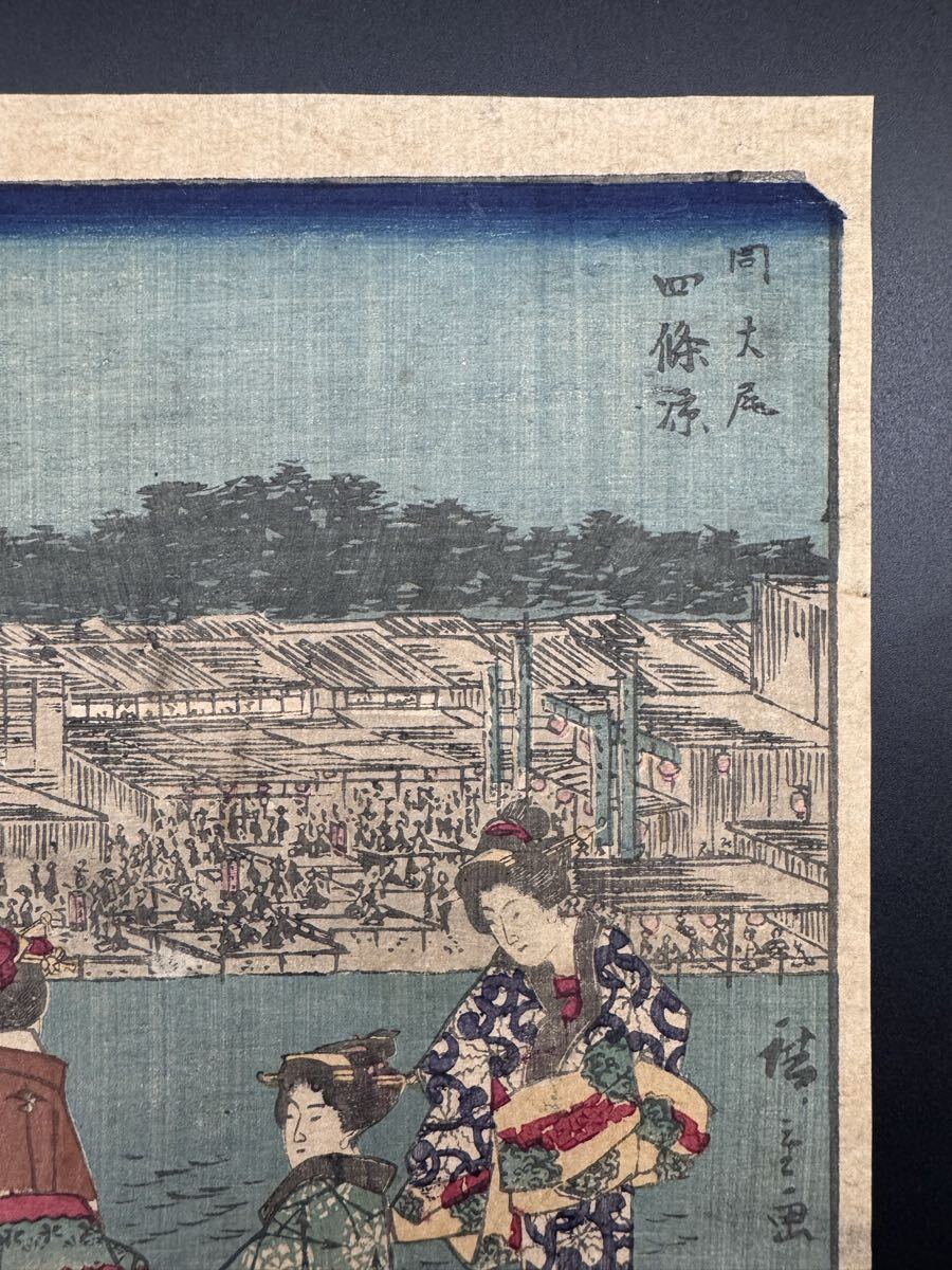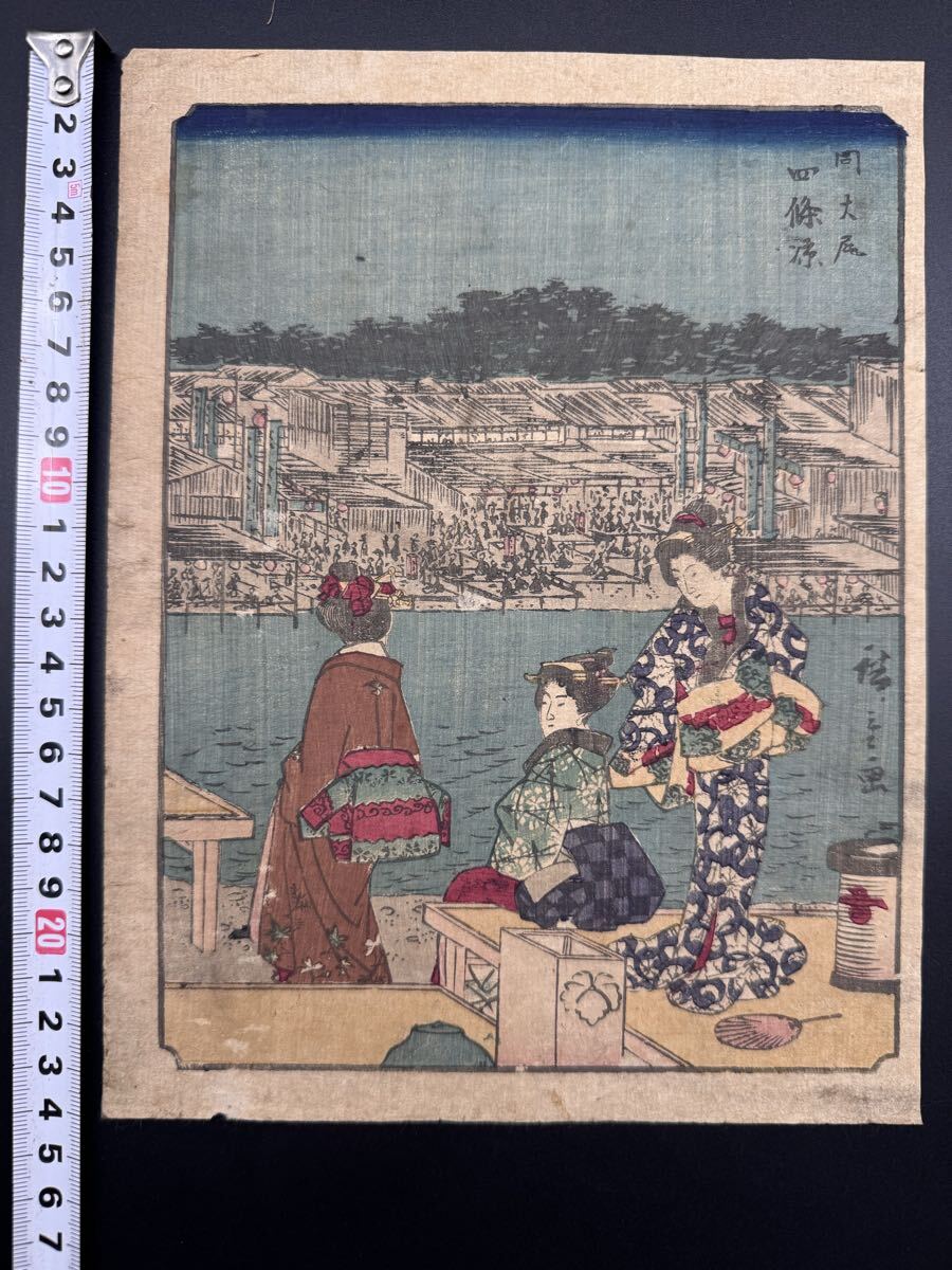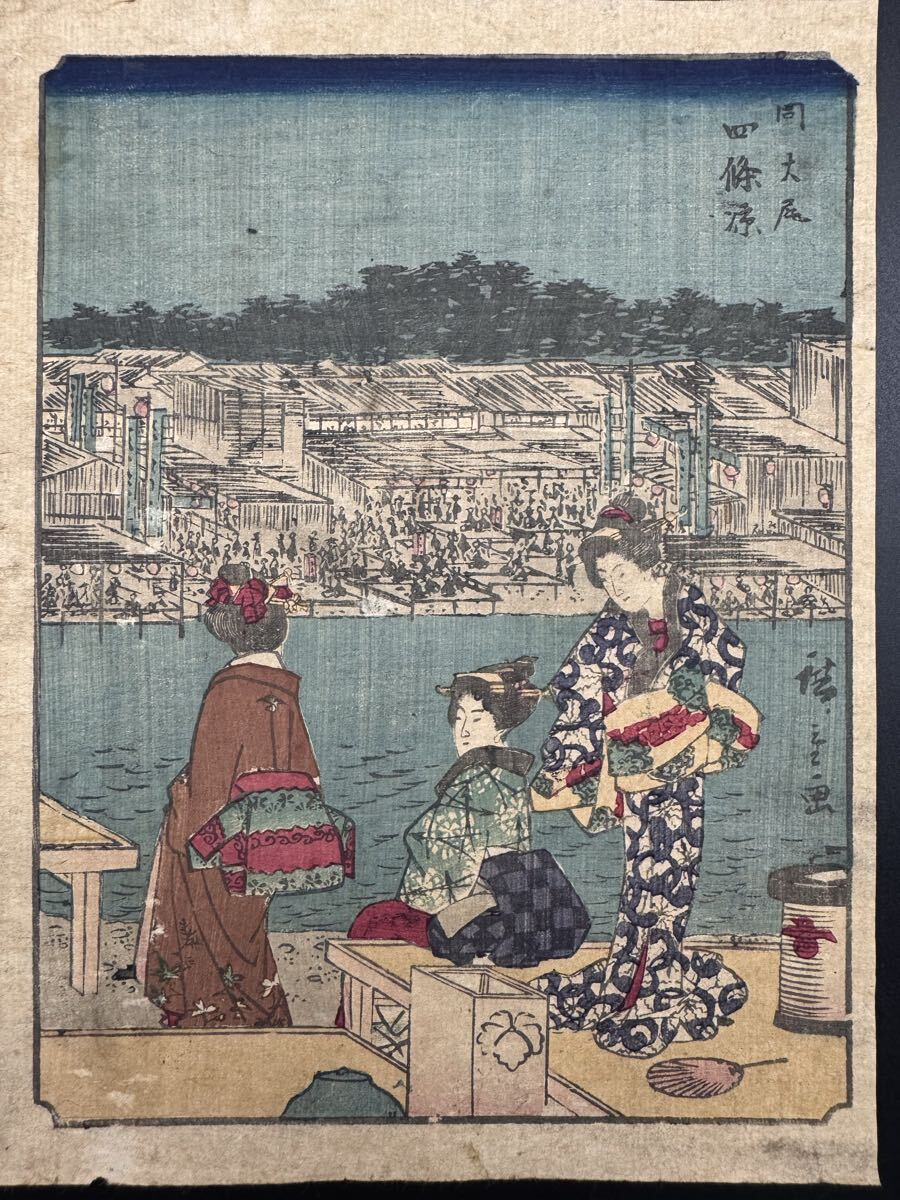 【真作】本物浮世絵木版画 歌川広重「五十三次 四條凉」江戸期 名所絵 錦絵 中判 保存良い