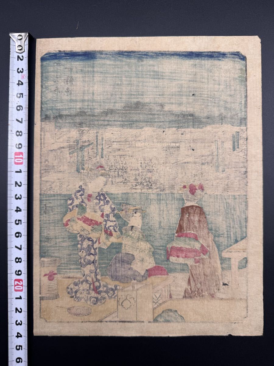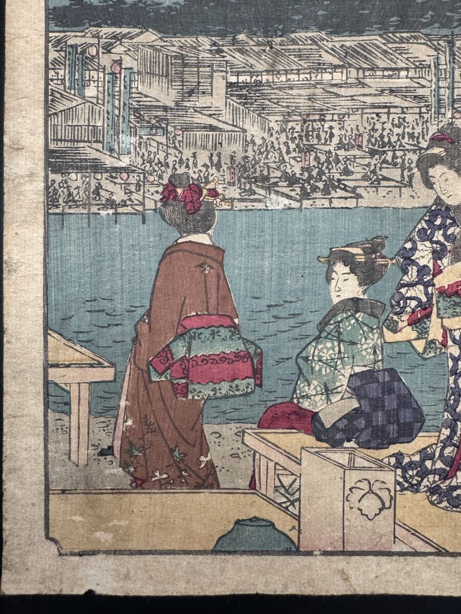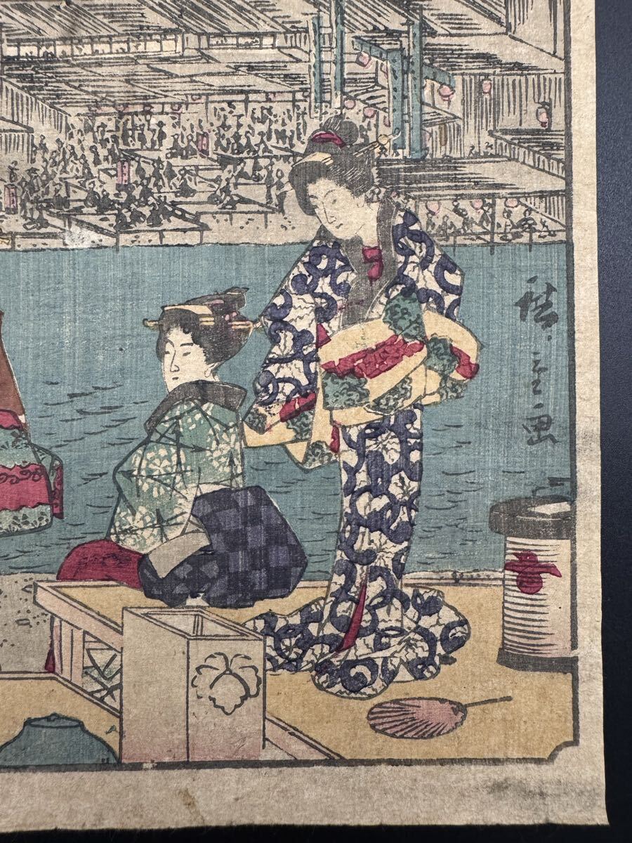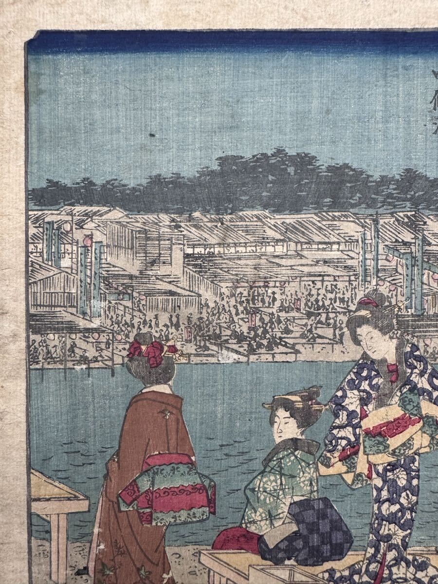 【真作】本物浮世絵木版画 歌川広重「五十三次 四條凉」江戸期 名所絵 錦絵 中判 保存良い
