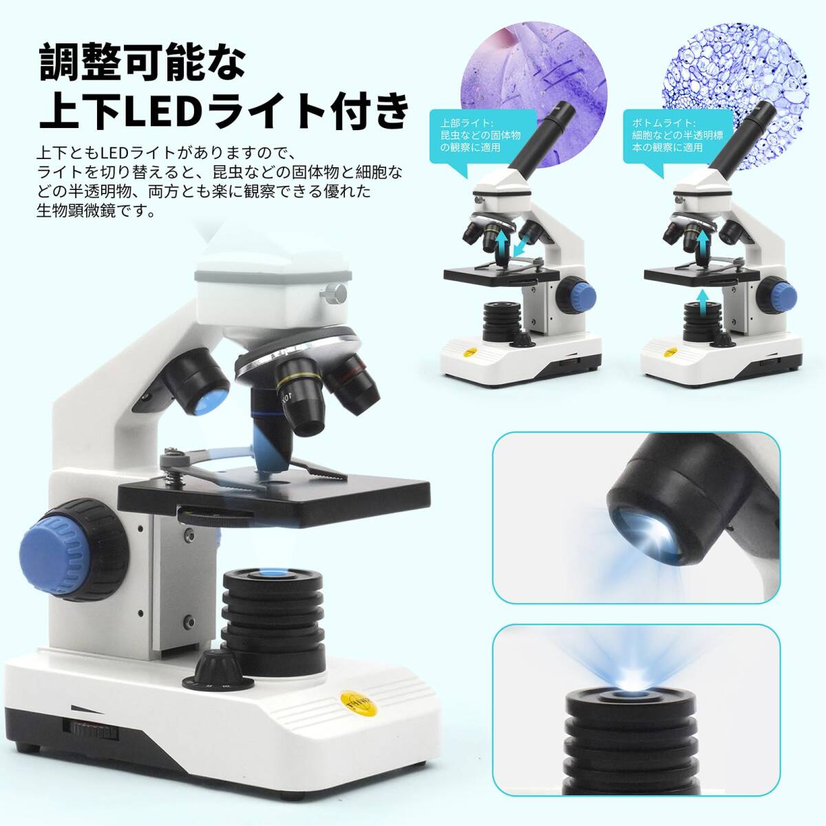 • [調整可能な上下LEDライト付き顕微鏡] 子供や学生にとって完璧なSTEMプレゼント!このセットは従来のセットと比べて、より豊富なアクセサリーが付属しており、今からでもミクロの世界を探検しましょう!上下ともLEDライトがありますので、ライトを切り替えると、昆虫などの固体物と細胞などの半透明物、両方とも楽に観察できる優れた生物顕微鏡です。