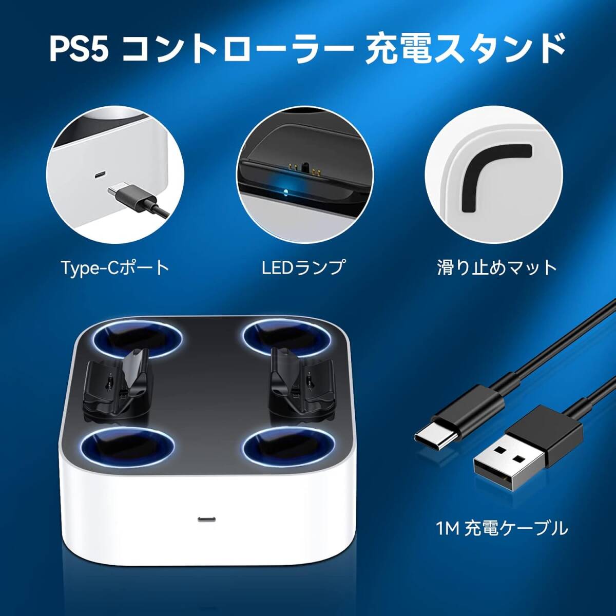 • 【LEDランプ・滑り止めマット】コントローラーが充電されると、LEDランプは青色に点滅し、コントローラーの充電が終了するとLEDランプは点灯します。PS5充電器には4つの滑り止めマットがあり、摩擦力を増やし、滑りを防ぐことができます。