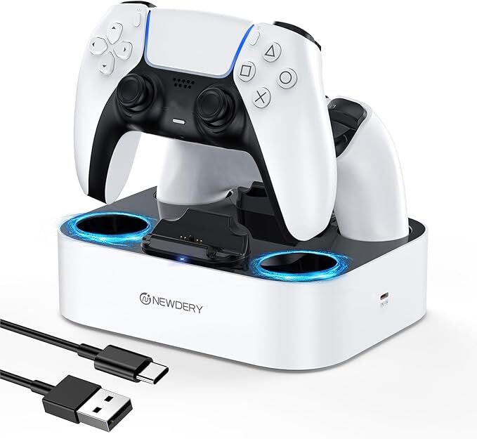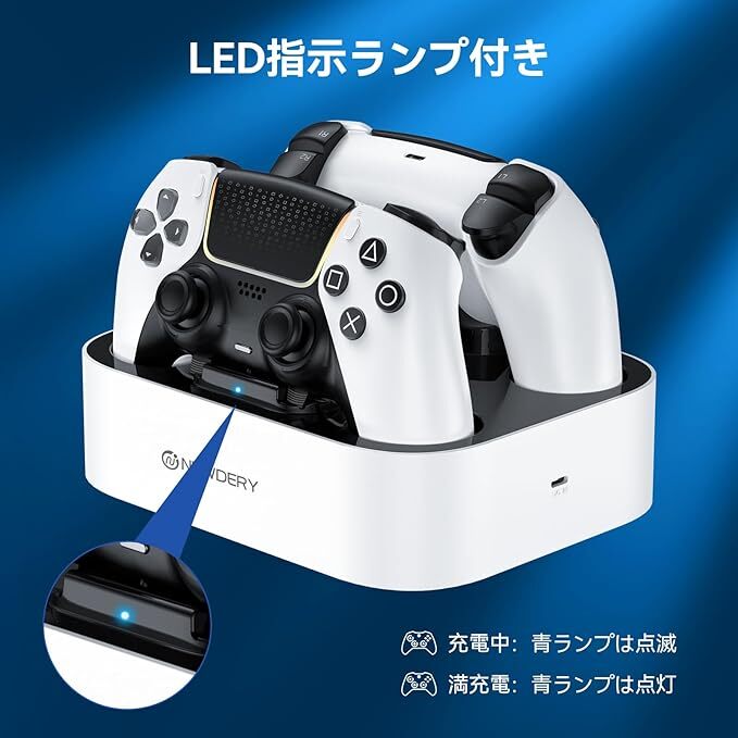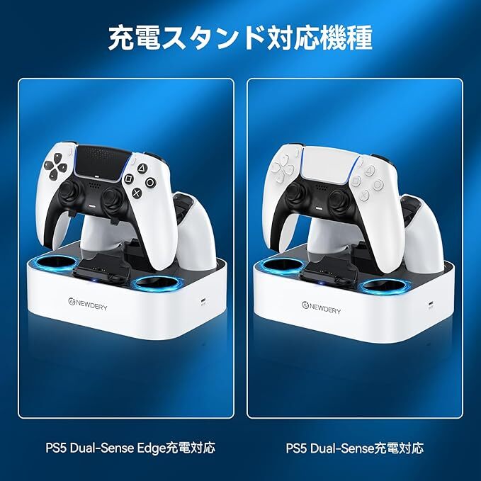 mj-H422★NEWDERY PS5 コントローラー 充電スタンド 急速充電 2台同時充電可能 置くだけ充電可能 過充電防止 USB-Cケーブル付属 LED指示ランプ付き ホワイト