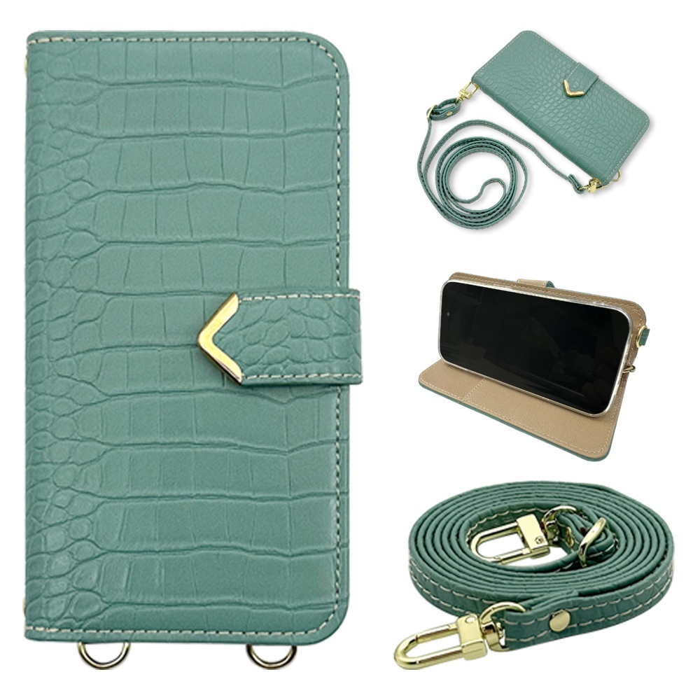 Galaxy S22 Ultra SC-52C SCG14 ギャラクシーS22ウルトラ 対応 スマホショルダー 手帳型 ケース (グリーン) myones 斜めがけ ストラップ 付き クロコ柄 型押し ワニ革調 スタンド機能 落下防止 カード収納 ニュアンスカラー くすみカラー PUレザー
