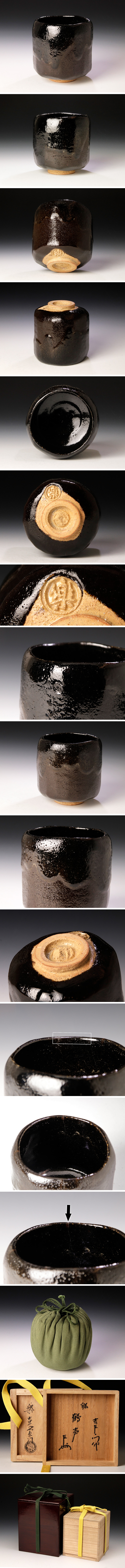 【十四代楽吉左衛門(覚入)】 京都の人(京都府出身) 東京美術学校(彫刻科)卒。師、13代楽吉左衛門(惺入)、13代惺入の長男京都伝統工芸家協会役員1945年14代楽吉左衛門を襲名。東京美術学校で近代的な造形を学び、また独自に緑釉、赤砂釉、幕釉、白釉などを研究し伝統を継承しながらも今までの歴代吉左衛門にはなかった色彩やデザインを強調するような作品を展開。没後十六代覚々斎宗左より覚入と号される。 【即中斎 表千家13世家元 無盡宗左(無尽宗左)】 12世敬翁宗左の二男であったが長男が早死であった為、1937年に家元を襲名。その後、42年に同門会(後75年に社団法人表千家同門会)を発足させ機関紙を発行するなど現代茶の湯の発展に尽力、70年には日本全国に支部を持つようになり、また海外においてもハワイ、ロスアンゼルス、サンフランシスコを拠点に普及活動を進める。 |