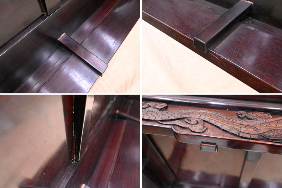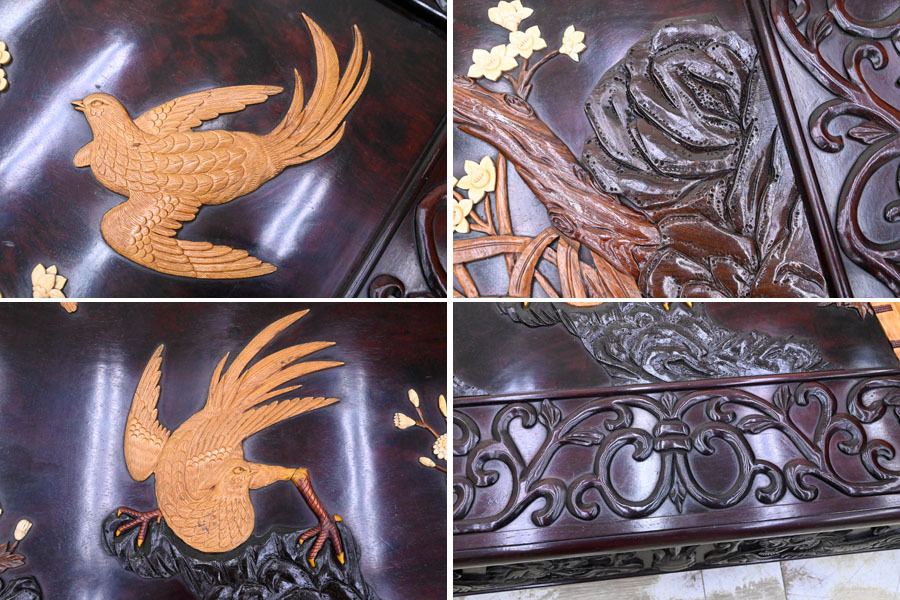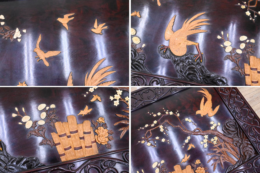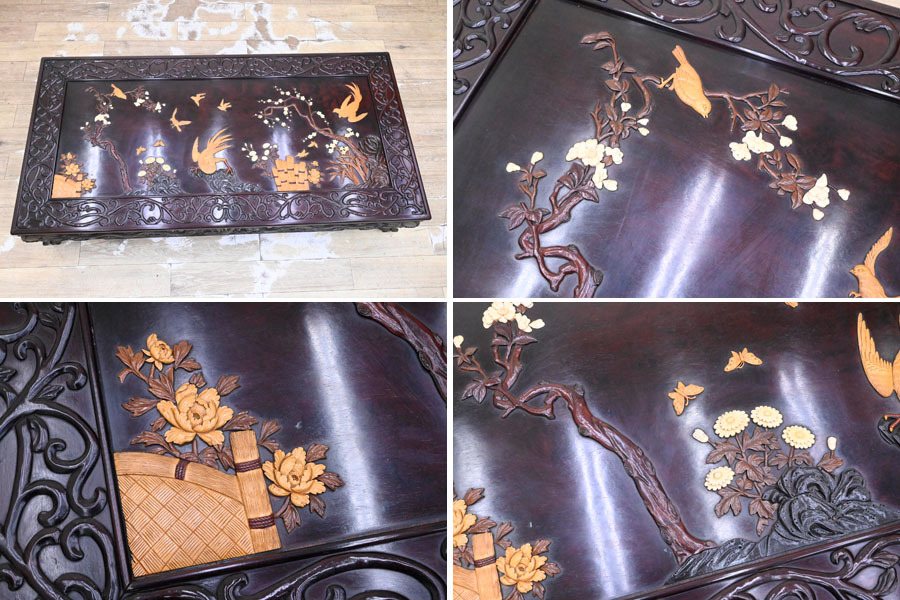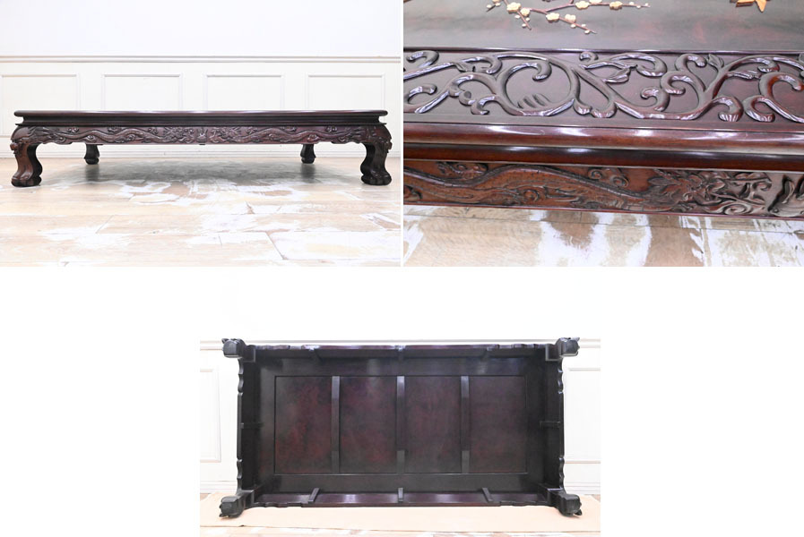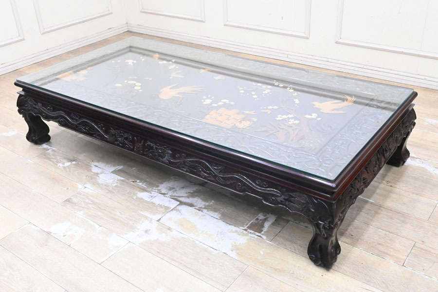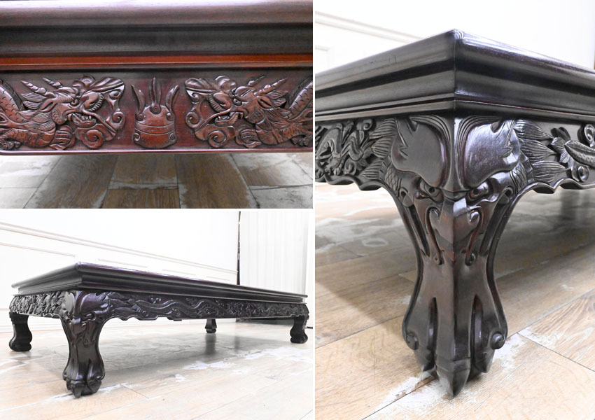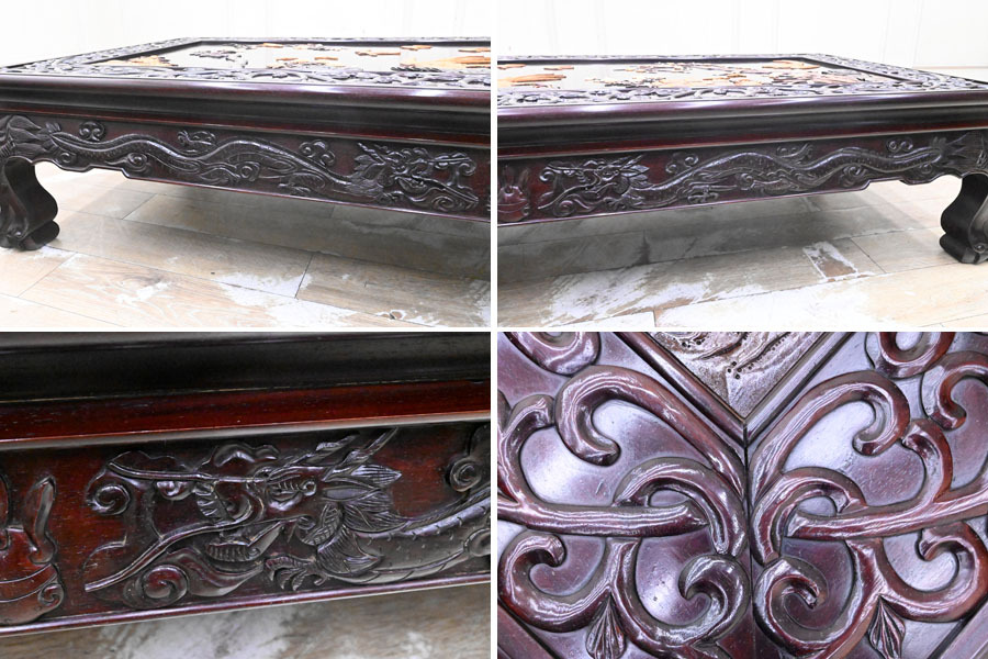 ----------------------------------------------------------------------------------------- ●送料や注意事項は必ずご確認下さい。落札後にトラブルになるケースが増えております。● ◆コンディションは写真・文章にて記載して有りますが、全てのキズの写真は掲載致しておりません。大きなダメージを除き見落とし、記載漏れが有る事はご了承下さい。 ◆当サイトにて出品する商品は多種多彩で、当方商品知識の無い物も多数ありますので落札後の質問やメンテナンス等にはお答えできません。 ◆入札された時点で、画像、文章をご理解していただいたものと判断させていただきます。不明な点は前もってQ&Aからお願い致します。入札後の質問やお電話等でのキャンセルは一切受け付け致しません。 ◆商品説明に「ノークレーム」と記載しているものに関しては、如何なる状況で届いても保証致しません。詳しくは注意事項の「商品到着後について」の最後に記載しておりますのでご確認下さい。 ---------------------------------------------------------------------------------------- 天板ガラスを付属しますので、条件付き限定家財おまかせ便での発送となります。 運送事故補償の無い、限定条件での家財便発送となります。 こちらの方法で配送の商品は、運送事故による破損補償や動作不具合を含め、補償を一切出来かねますので、ご理解の上ご利用下さい。注意事項に記載の補償も適応外です。 破損した際に、初めから破損していた、梱包方法が悪い、運送方法が悪い等クレーム言われる方おられますが、上記内容が受け入れられない場合は、お客様で業者を手配頂けると幸いです。 ガラスが要らない場合は通常通りの保証となります。 見事な彫刻が美しい座卓、中古品の出品です。 天板から脚の細部まで職人の技が堪能できる素晴らしいお品です。 天板はまるで芸術の宝庫と言える美しく、見る者を魅了するでしょう。 幅181x90 高37.5(ガラス込み)cm 【コンディション】 底面杭全て出っ張っている、杭部分フレーム割れヵ所、底面真中フレーム割れ、接合部スキマ、ガラスキズ、その他多少のキズ、ダコン、汚れ等有りますが、状態は良好です。 | ||