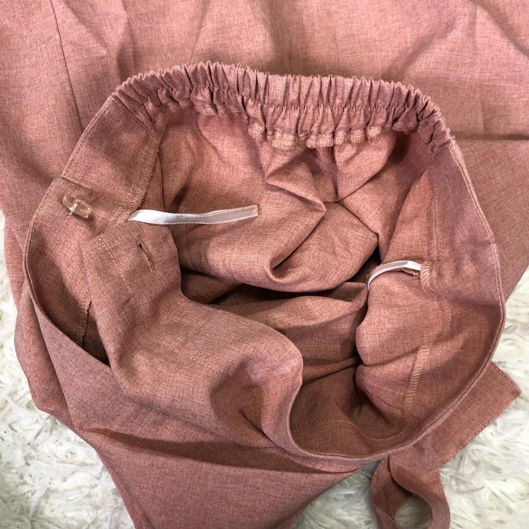 タイトシルエットですっきりとした印象、ウエスト部分にDカン付きのベルトがあり、ラップデザインになっています。ウエスト後ろはゴムです。身長160cm着用で、足首より10cm位上の長さです。