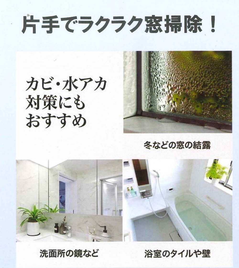 フラットな面の水をサッと吸引するので、カビの原因となる浴室の壁・床の水滴取りや冬場の結露取り、テントやタープの夜露の処理、雨上がりのガーデンテーブルなど、季節を問わず毎日活躍します。洗車後の窓の拭き上げにも便利です。