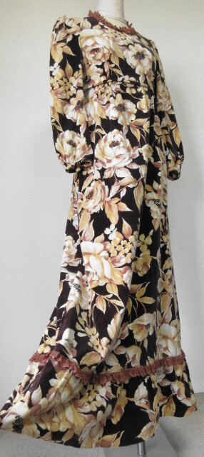 古着♪レトロ・Vintage茶ベルベット花柄ドレスワンピ♪70s60s70年代60年代ヴィンテージ昭和モダン長袖秋冬アンティーク即決ヨーロマキシ丈