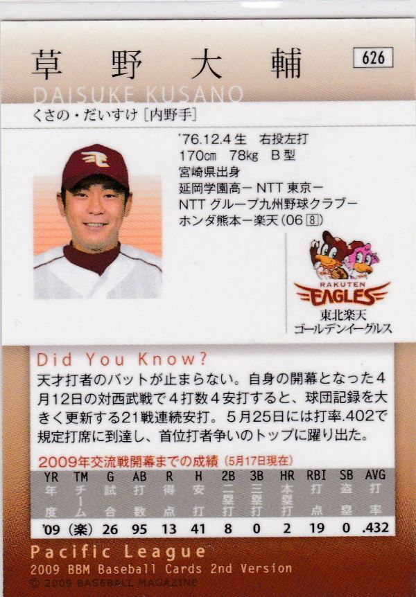 ●2009BBM/2nd 【草野 大輔】 銀箔押サインパラレル No.626:楽天
