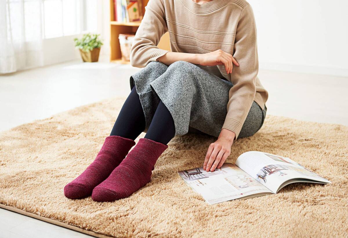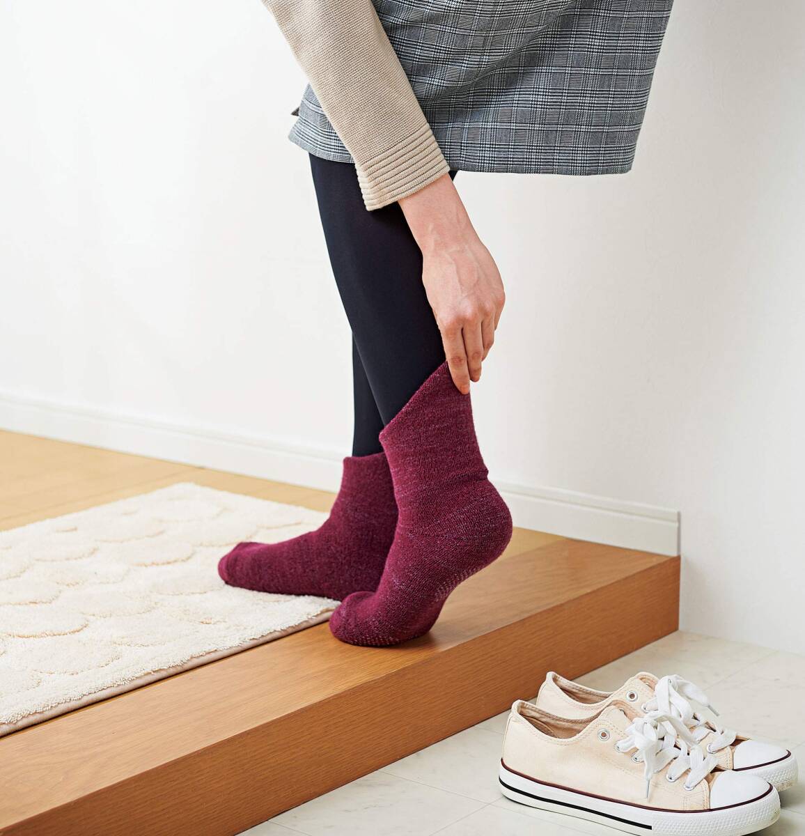 足首まですっぽり!包み込んであたたか。 二重編み構造で魔法びんのようにあたたかさキープ。 極厚でスリッパいらず!キッチンでも活躍。 つま先とかかとの底面部分に滑り止めつき。 繊維自身が発熱する保温素材『エクス(R)』使用。ムレ感やべたつき感のないサラッとした心地よさを維持する放湿効果。