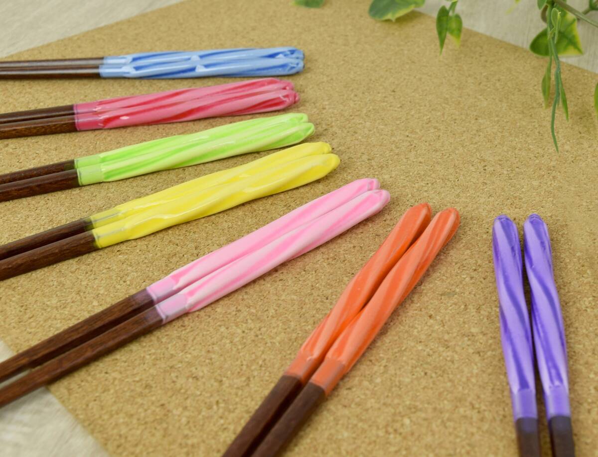 飴を伸ばしたような、液体から固体へと飴が変わる様子を再現したデザイン。 色鮮やかなカラーは食卓を華やかに。視覚的に楽しめる一膳。 持ち手の下から箸先は馴染みのある天然木で、箸先が細くはさみやすい。和ごころと遊び心がつまったお箸。 【お箸を選ぶ目安】 片手で人さし指と親指を90度に広げる。両方の指を結んだ長さに1.5を掛けた長さのお箸が、その手に丁度いいといわれている。