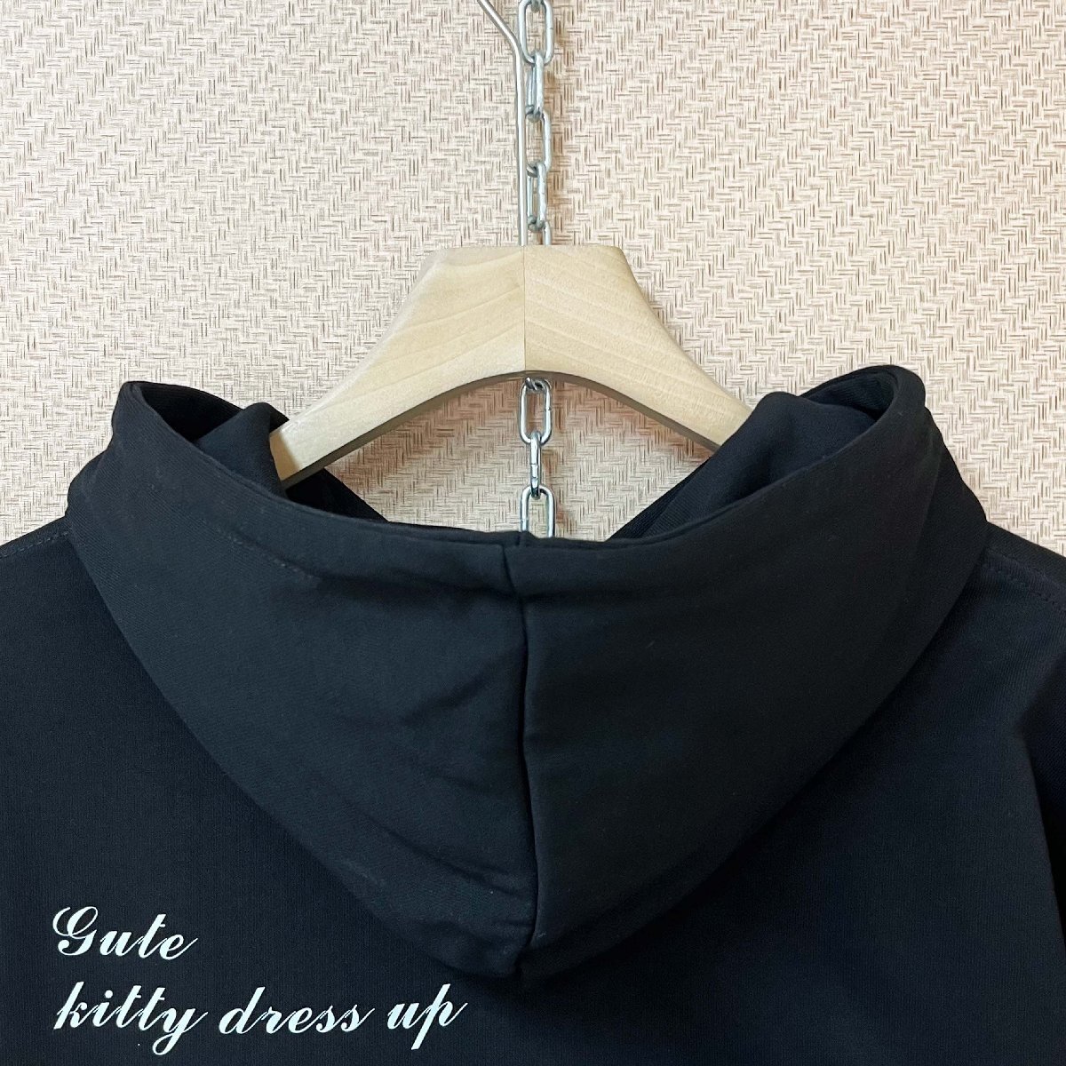 ベーシックなフード付きデザインで着脱しやすく、普段使いにぴったり。フロントには気品あふれるネコのプリントをあしらい、シックで個性的な雰囲気を演出。さらに英字柄を組み合わせることで、ファッション性もぐっとアップしています。