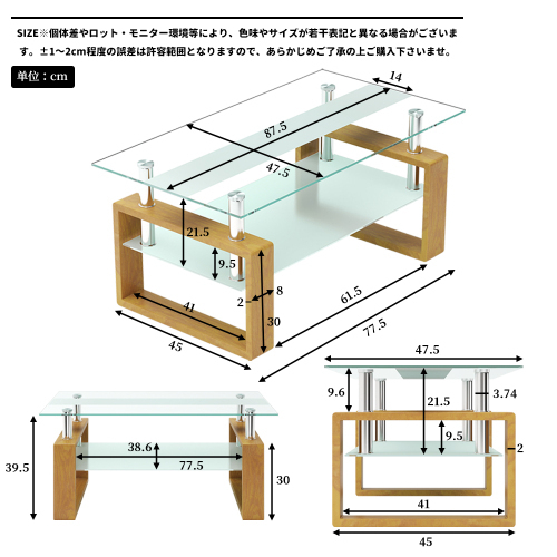 ガラステーブル ローテーブル コーヒーテーブル 幅87.5x奥47.5x高さ39.5cm 収納棚 口字型のテーブル脚 強化ガラス天板 クリア棚 お KU485