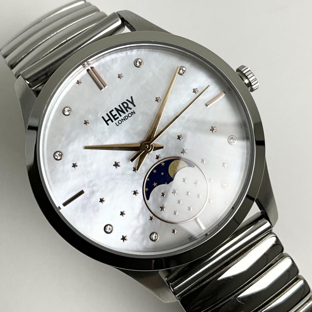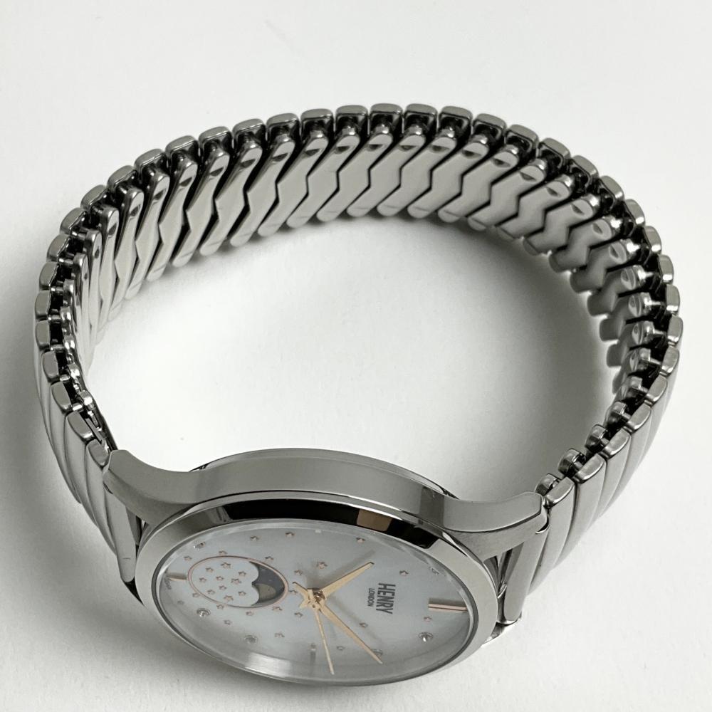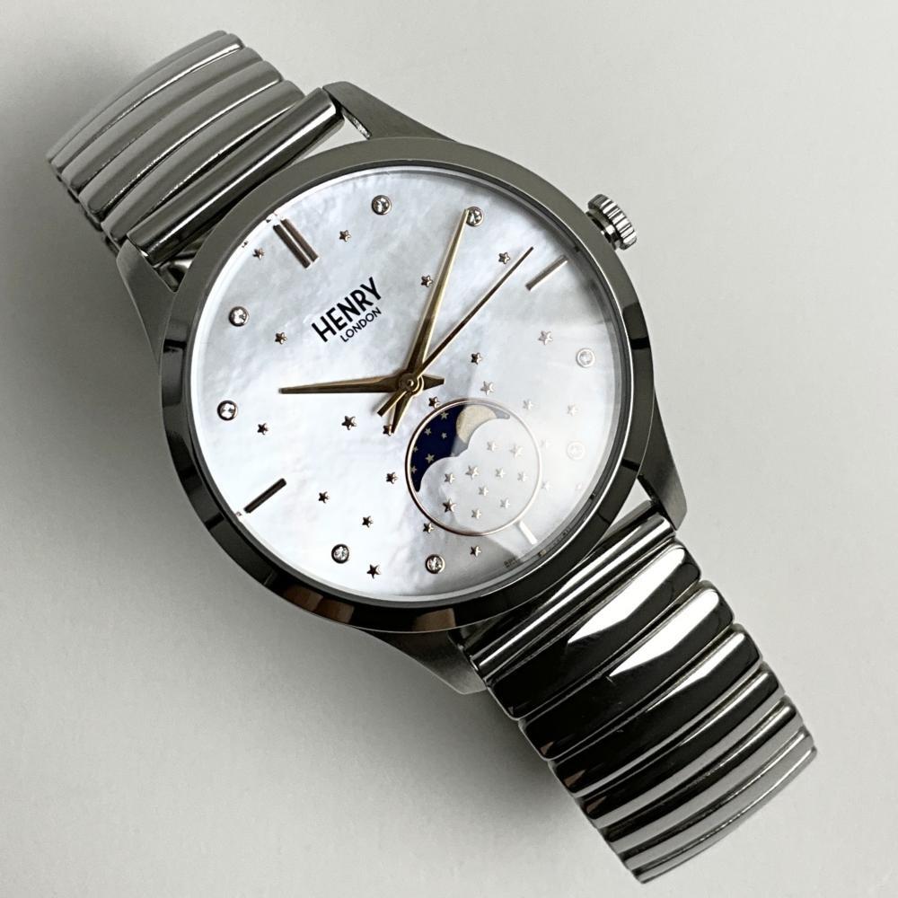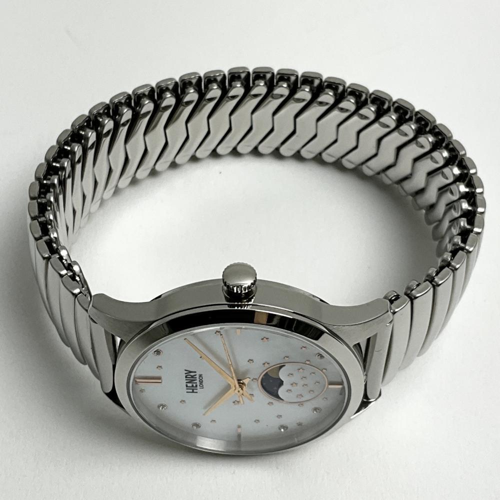 | 商品名 | ヘンリーロンドン 腕時計 レディース シルバー ムーンフェイズ シェル HENRY LONDON HL35-LS-0327-TS 伸縮ベルト ステンレス 月 星 |