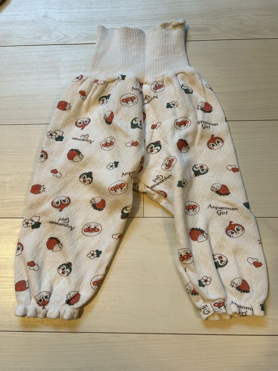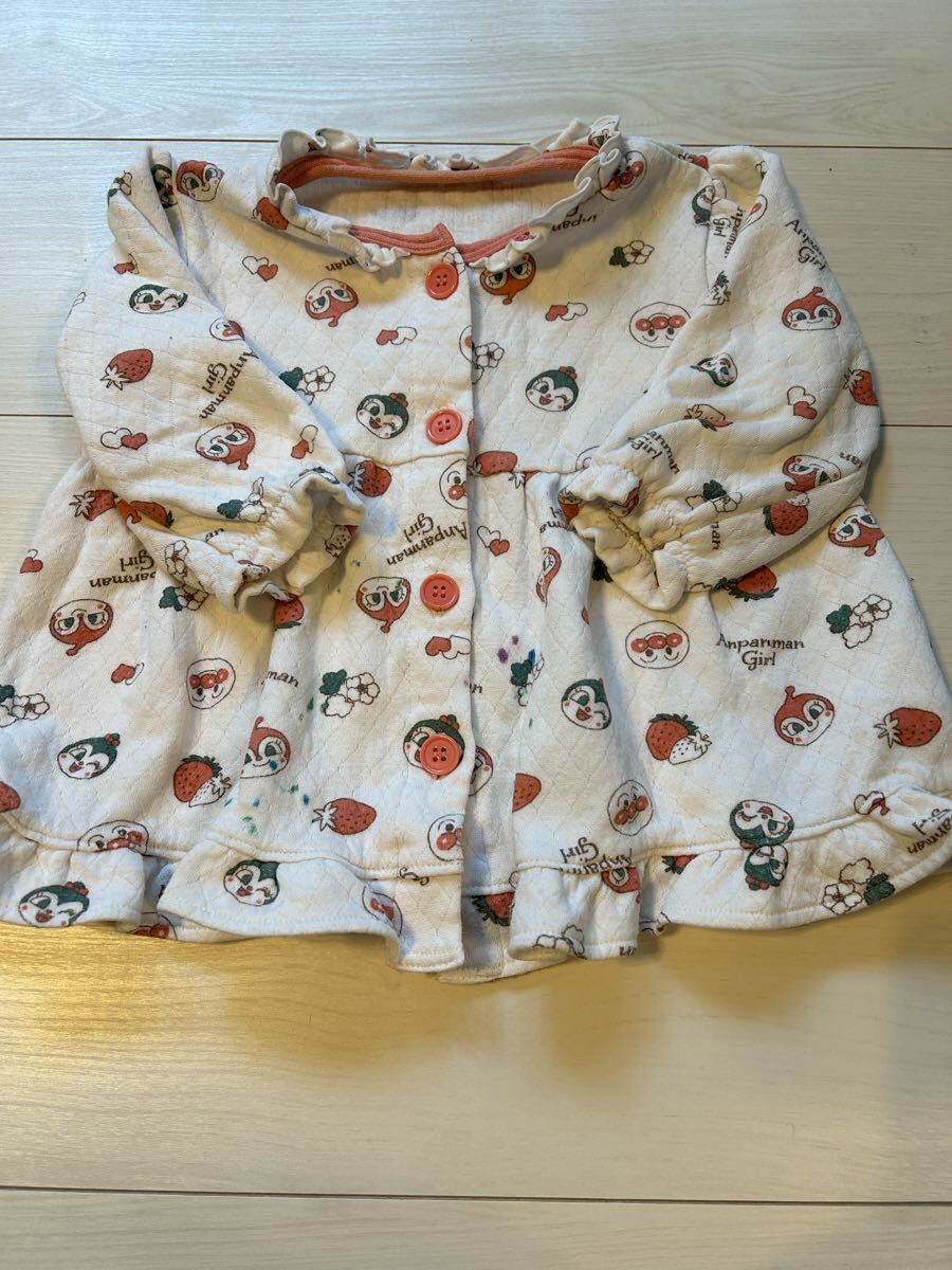 アンパンマン ガールの長袖パジャマです。全体にアンパンマンのキャラクターとイチゴの柄が散りばめられており、とても可愛らしいデザインです。サイズは90cmで、これからの季節にぴったりのアイテムです。着用に伴う多少の毛羽立ちと、小さな薄いシミが数カ所あります。