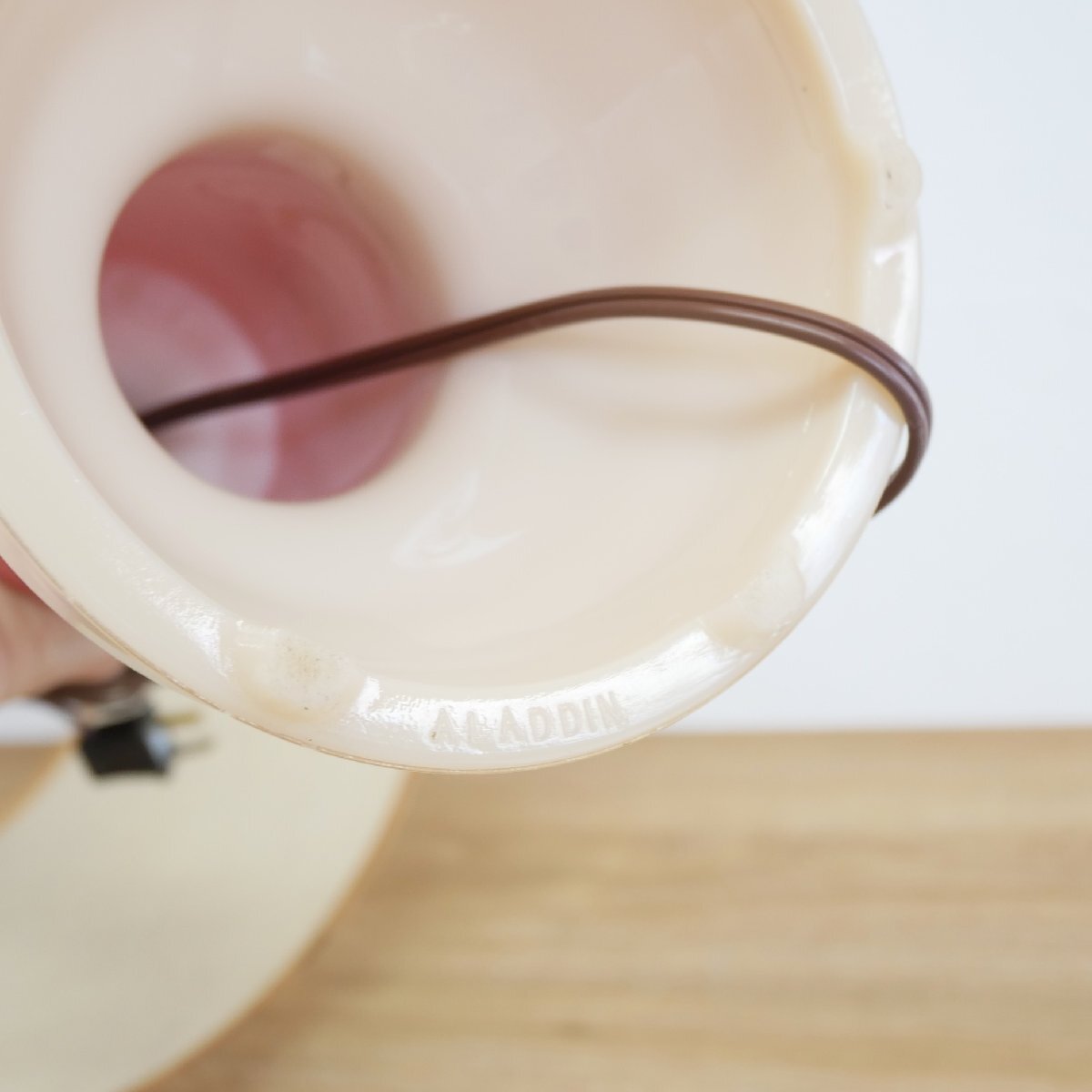 | 商品説明 explanation | 1930年から1940年代頃の「ALADDIN」アラジン製 テーブルランプです。 ガラスの支柱はアールデコデザインで、シェードは樹脂製で趣があります。 電球は日本で市販されているLED(E26,60W相当)を使用しています。 お部屋のインテリアにいかがでしょうか。 |