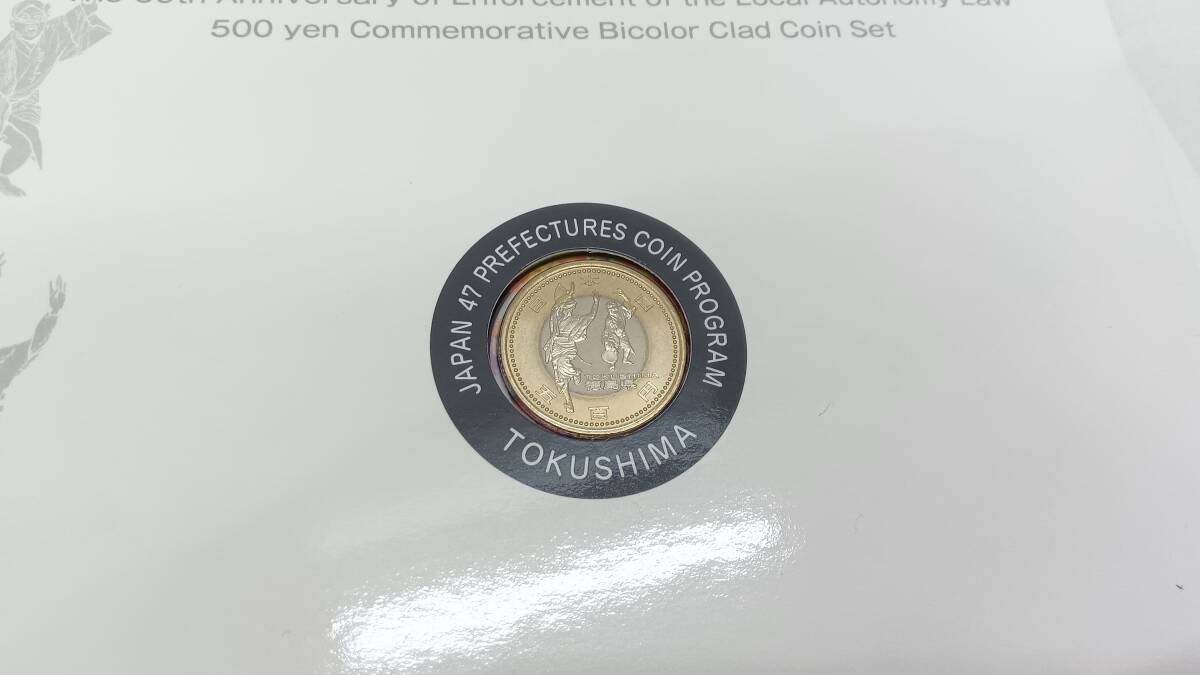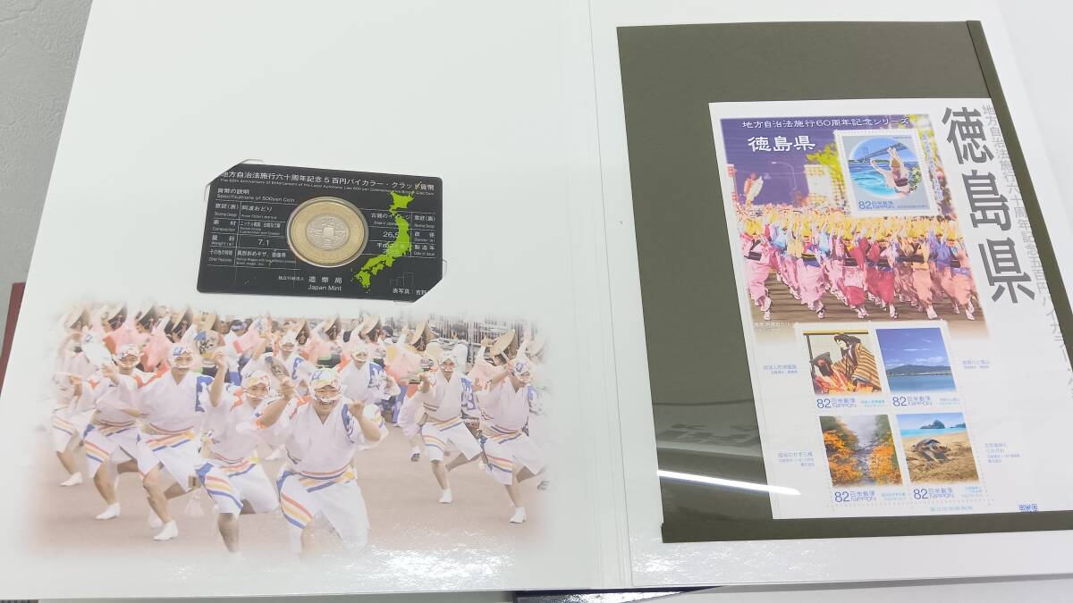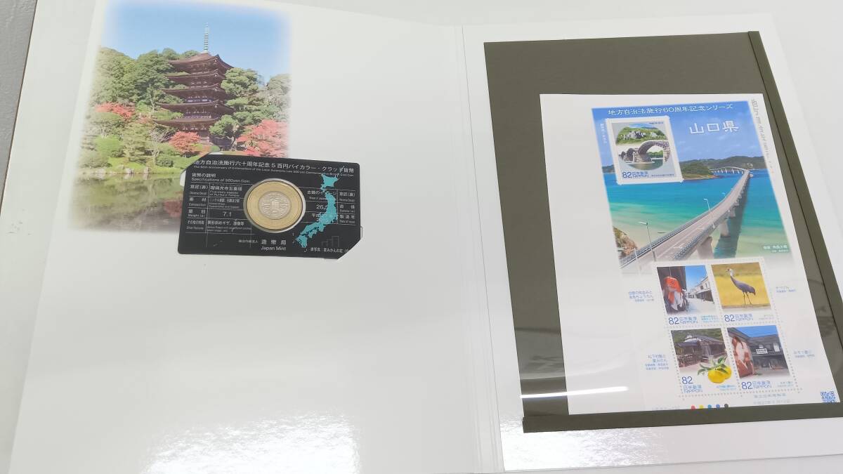 ・地方自治法施行60周年記念 バイカラー500円+82円切手セット (山口・徳島・福岡) 額面1500円分 記念硬貨 記念切手