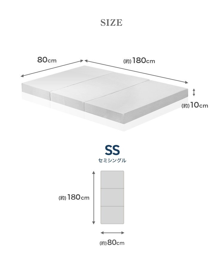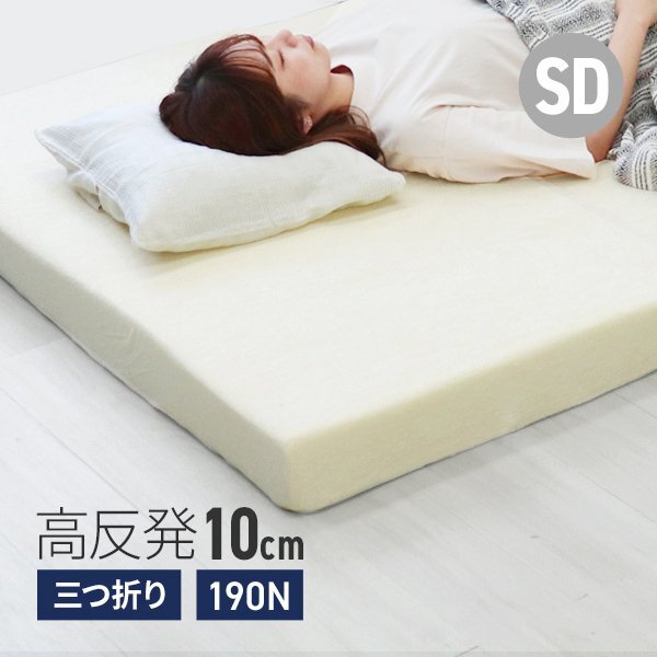 適度な硬さで身体をしっかり支える、三つ折りタイプの高反発マットレスです。 柔らかいマットレスとは違い、身体の沈み込みを軽減した腰に優しい寝心地です。 高反発マットレスのウレタンフォームは弾性が高く、適度な硬さで身体を支えるので、底つき感もなくへたりにくいマットレスです。 寝返りが多い方や仰向けに寝ることが多い方におススメです。 簡単にたためる三つ折りタイプなので、お部屋で立て置きして日当たりのいい場所で部屋干しが可能! 簡単着脱!洗えるU字ファスナーカバ付きです♪ 【商品仕様】 カラー:ベージュ サイズ(約):幅120cm×長さ195cm×厚み10cm(セミダブルサイズ) 折り畳み時(約):幅120cm×長さ65cm×厚み30cm 素材:高反発ウレタン 、パイル生地 他 硬さ:190ニュートン ※耐熱仕様ではございませんので、電気毛布との併用はおやめください。 |