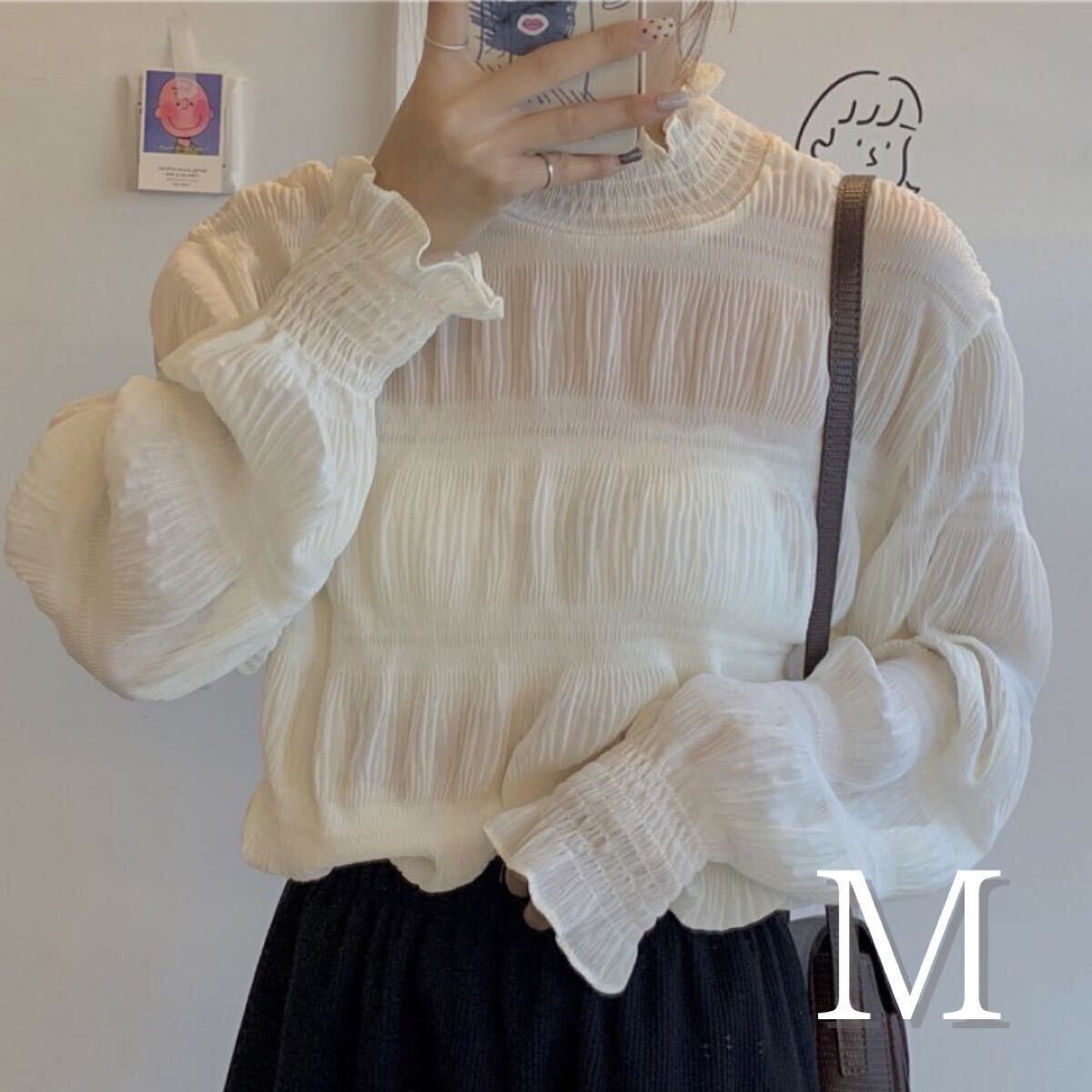 長袖 シアー ハイネック トップス シャツ フレアスリーブ シャーリング M