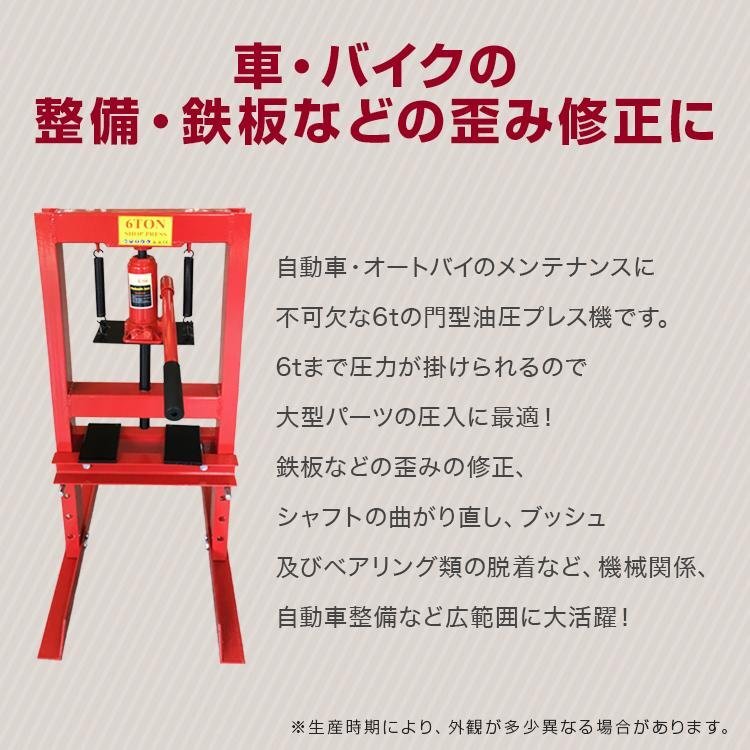 | プロ仕様、自動車・オートバイのメンテナンス用の6トンの門型油圧プレス機です。 6tまで圧力が掛けられます。大型パーツの圧入に最適! 鉄板などの歪みの修正、シャフトの曲がり直しブッシュ及びベアリング類の脱着など、機械関係、自動車整備など広範囲に大活躍です。 【商品仕様】 ・重量(約):25kg ・能力:6t ・ストローク幅:75mm ・ワーキングレンジ:0~380mm ・カラー:レッド ・専用プレート2枚付き 【注意事項】 ・組み立てが必要です。 ・大型商品なので大人2人以上での組み立てをお勧めします。 ・写真と実物は多少異なる場合がございます。あらかじめご了承下さい。 ※大型商品のため、特別中継料が適応されます。(離島+2200円/北海道+1100円/沖縄本島+2200円) 離島の方は、後ほど金額を修正してメールでお知らせさせて頂きます。 |