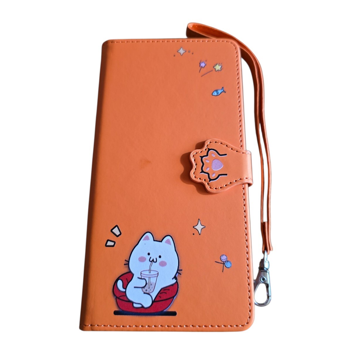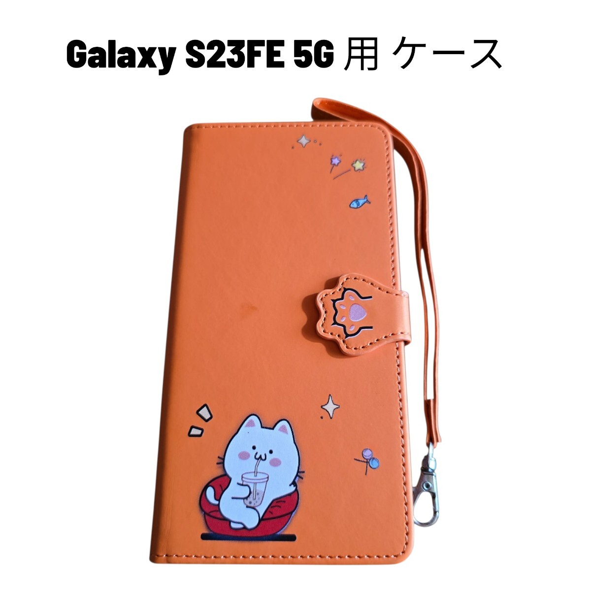 Galaxy S23 FE 5G 専用のキュートな手帳型スマホケースです。 タピオカドリンクを飲む猫のイラストと、マグネット式の肉球留め具がとっても可愛いデザインです。