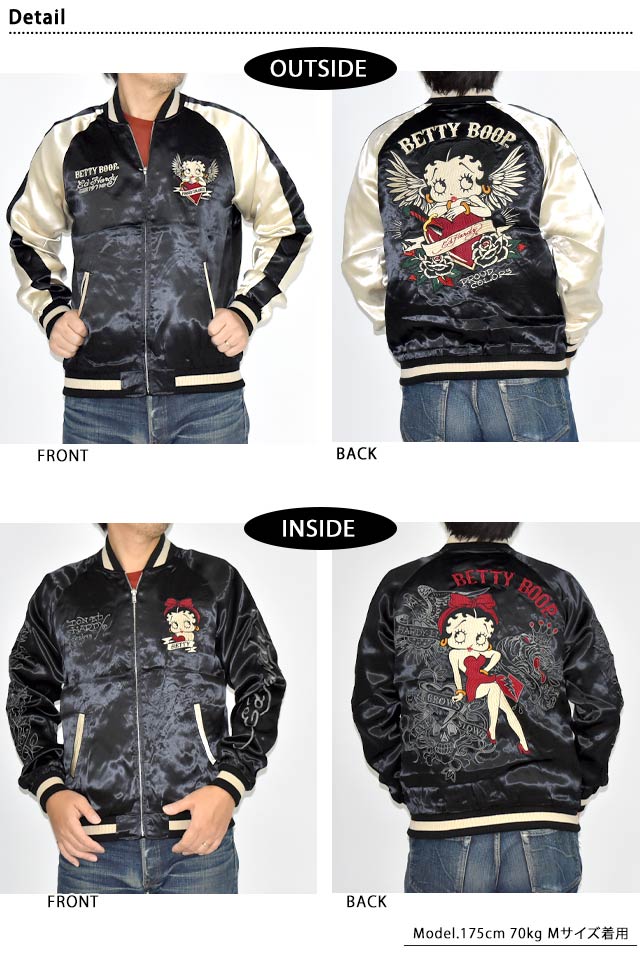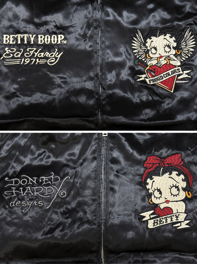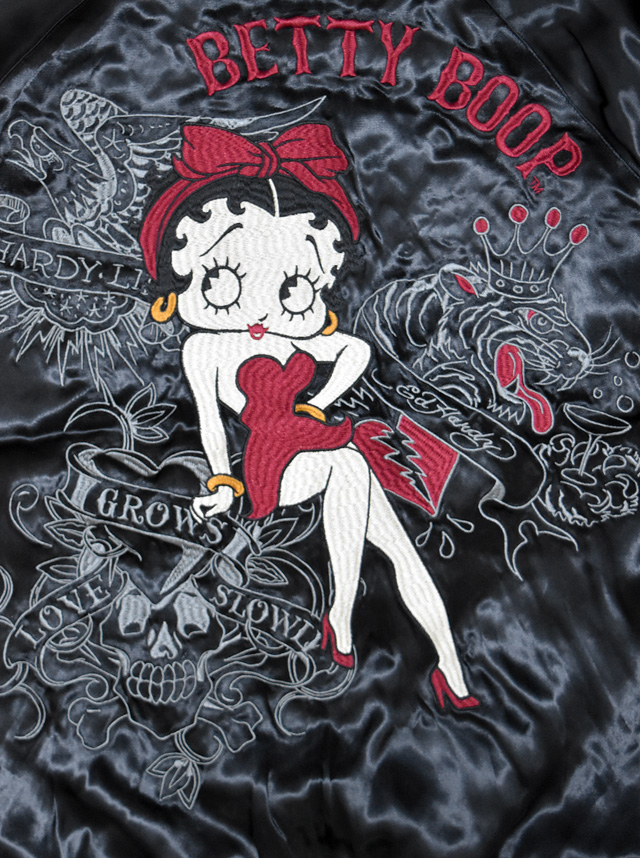 Ed Hardy×BETTY リバーシブルスカジャン(BED-2510)のご紹介です。 大きな瞳とぽってりした赤い唇が印象的な女の子、ベティ・ブープ(Betty Boop)。 タトゥーアーティストのドン・エド・ハーディー氏のシグネチャーブランドである「エドハーディ」との、夢のコラボレーションが実現しました。 表と裏、それぞれ異なる絵柄をデザインを落とし込んだスカジャンです。 配色も異なり、一着で二着分の着こなしをお楽しみいただけます。 ボディーにはレーヨンサテンを使用しており、美しいドレープで陰影もくっきりと浮かび上がります。 一枚持っているだけでずっと使えるスカジャン。 | ||||||||||||||||||||