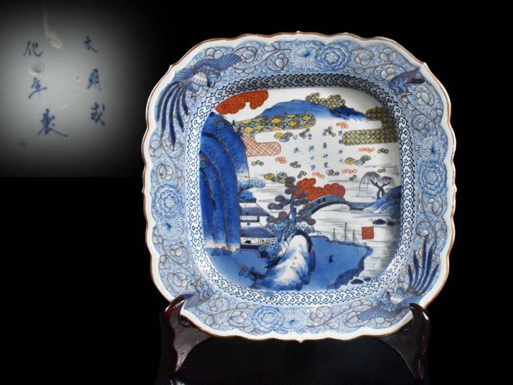 | 商品名 | 【雲】某収集家買取品 大明成化年製 古伊万里 染付漢詩楼閣山水図大皿 飾皿 41.5×41×7cm 古美術品(線描)DJ620 CTDdjnhb |