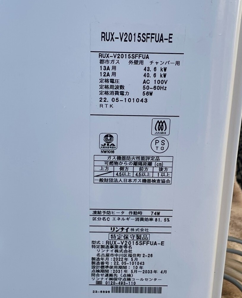 | 製品名 AA-264 業務用 リンナイ ガス給湯器 RUX-V2015SFFUA-E 2022年製 都市ガス W345xD240xH700 店舗用品 厨房 中古 |