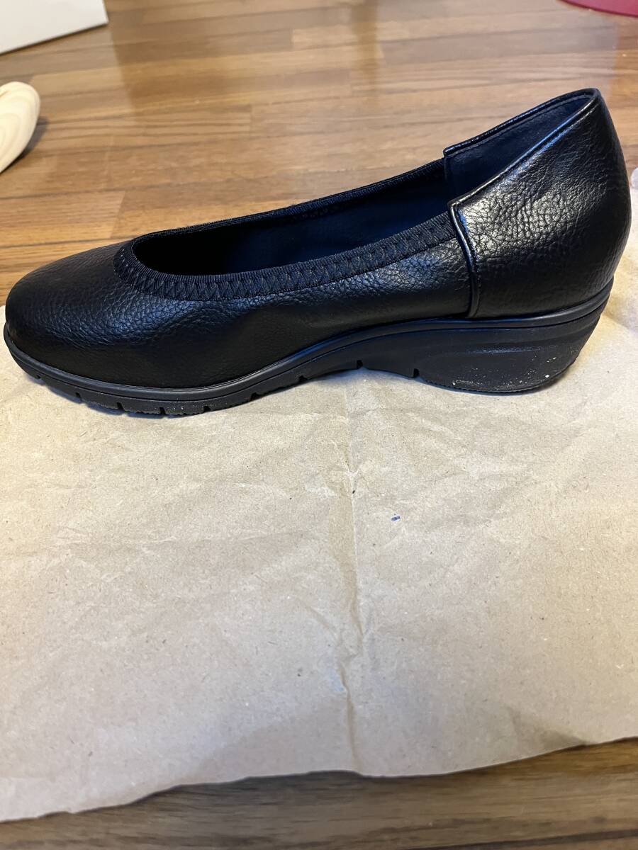 合成皮革のブラックウェッジヒールパンプス、快適な履き心地。