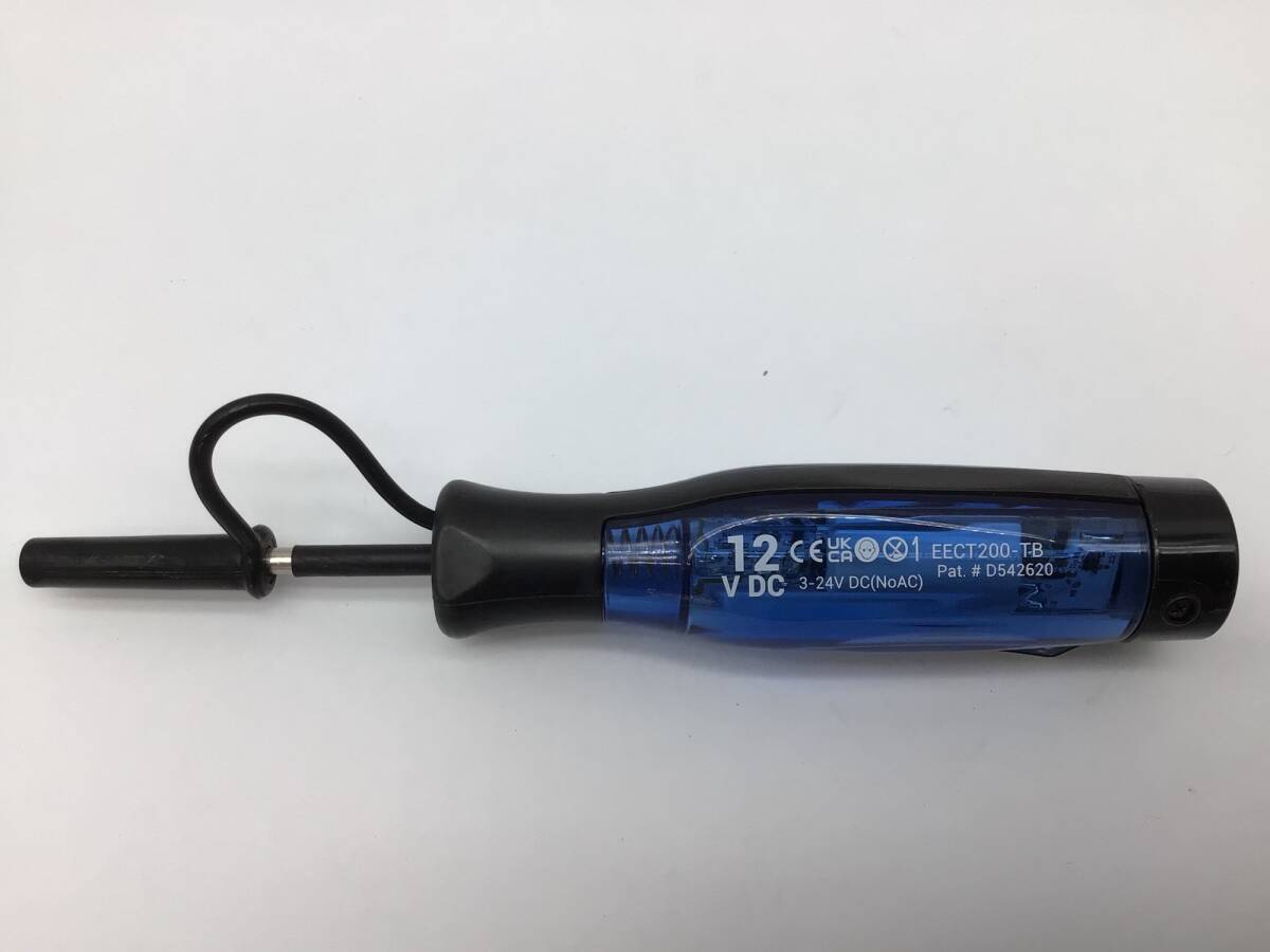 | 機能特徴 | 3~24Vまでの直流導通チェックを行う事が出来るテスターです。 アースコードが無いコードレスタイプとなっているのが大きな特徴です。 導通測定時には、本体エンドのスチール部分を片手で触れ、プラス側の配線にテスター先端を当て、もう片方の手で車体のボディー等の金属部分に触れればアースをとる事が出来るので、アースコードを接続する事なく導通チェックが行えます。 導通時には、本体内部部のLED(白色)が点灯すると同時にブザー音が鳴り、確認出来る様になっています。 ●測定可能電圧(DC):3~24V |