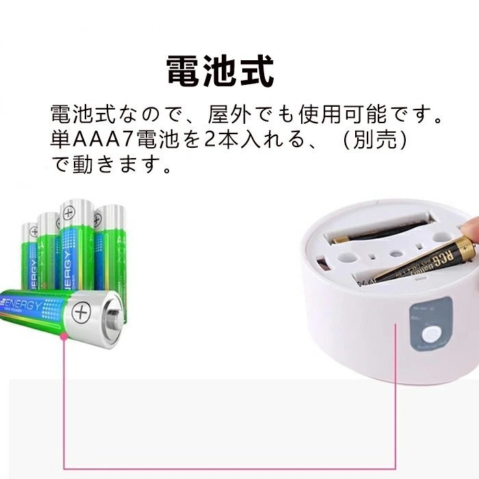 電池式なので、屋外でも使用可能です。単7電池2本(別売)で動きます。