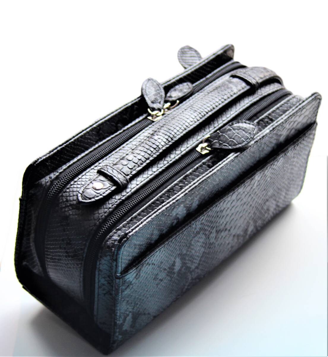 スクエアタイプの重量感のあるデザインで、ダブルZIPを開くとそれぞれ独立した収納ポケットが現れるデザイン。