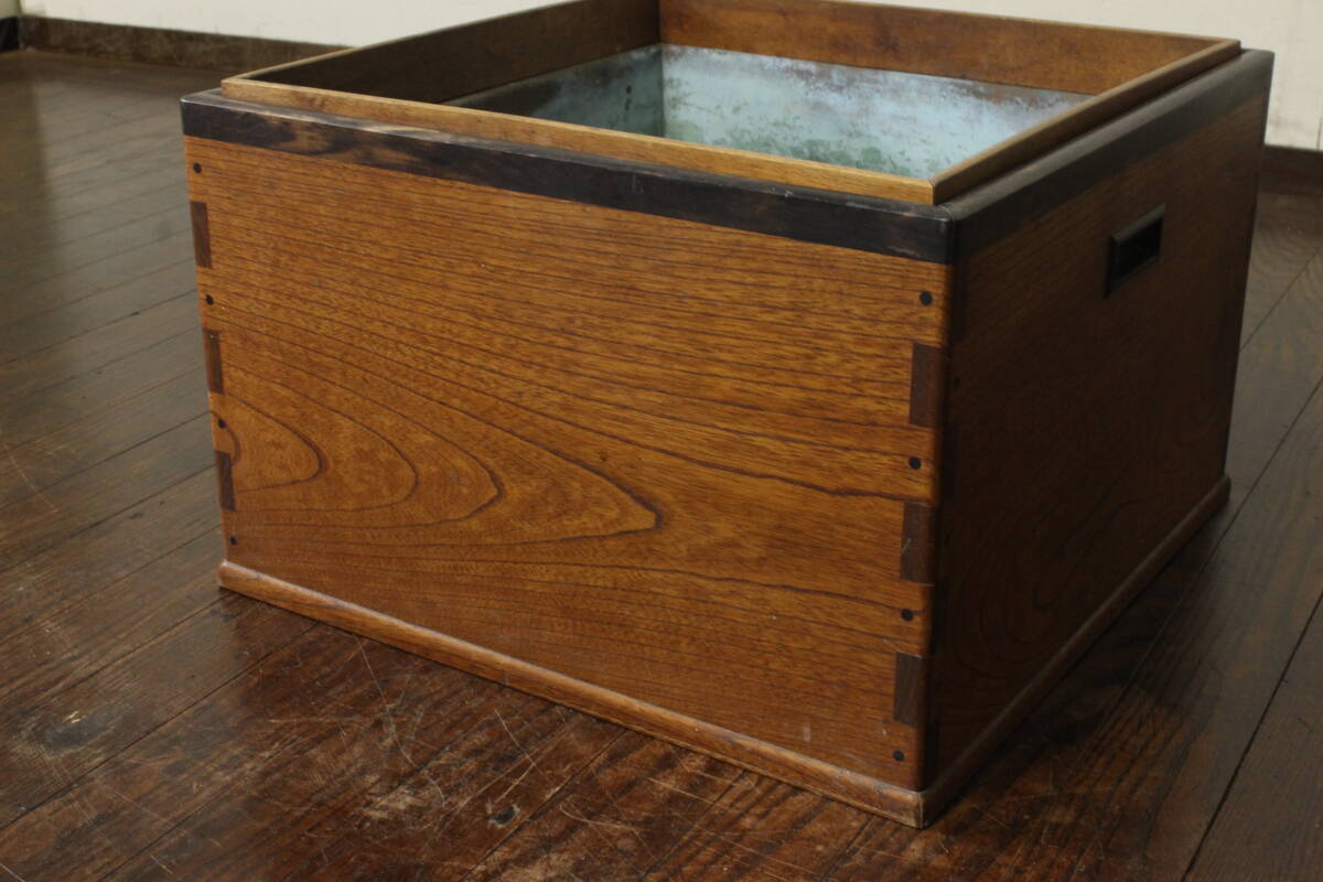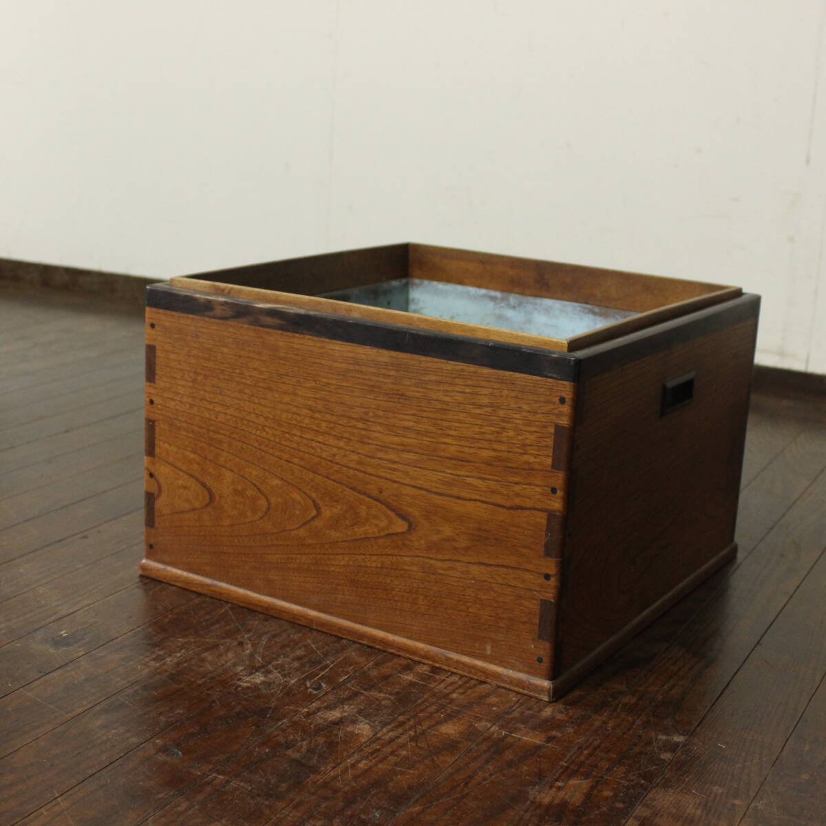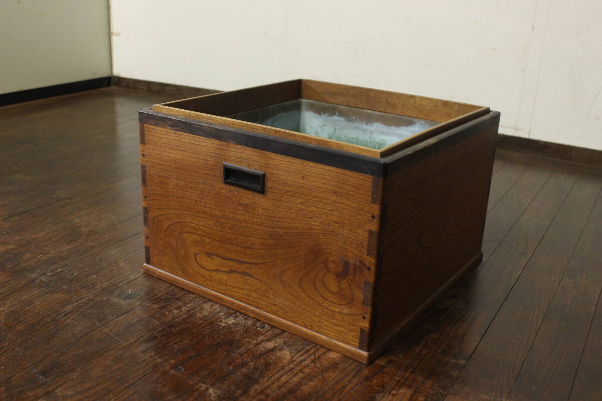 欅材の杢模様がとても良く、 実用は勿論、 アンティークアイテムとしてもオススメです。 落としは銅製です。 |