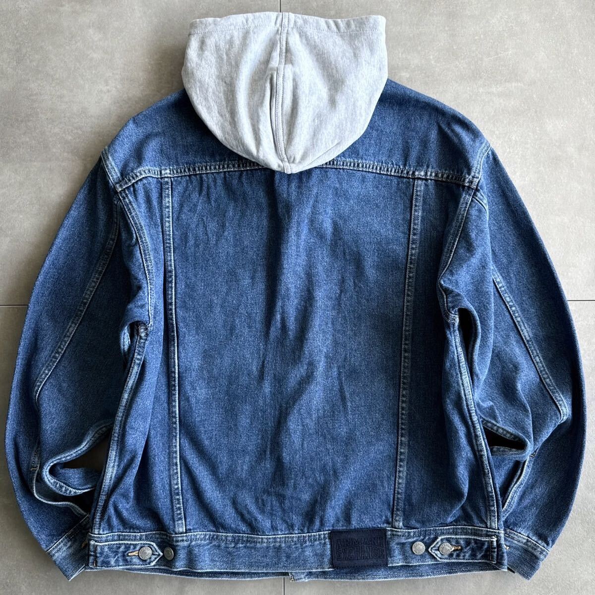 王道のインディゴブルーをベースに、ほどよいウォッシュ加工を施した上質なデニム地が、こなれた印象を演出します。フード部分はスウェット素材で柔らかく、着脱可能な2WAY仕様。季節やスタイルに合わせて、カジュアルにもクールにも着こなせる万能アイテムです。