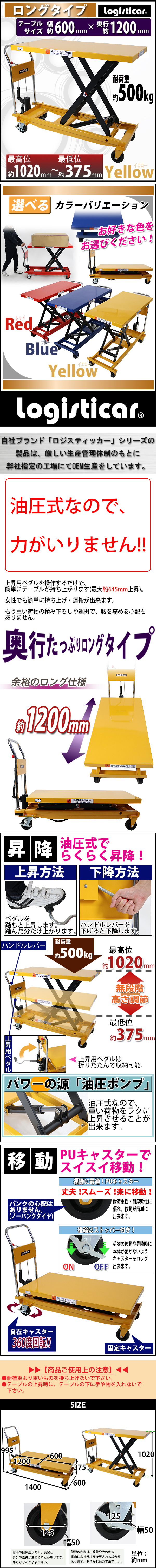 | 商品名 | 送料無料 油圧式昇降台車 リフトカート テーブルカート ハンドリフター ロングタイプ 黄 テーブルサイズW約600mm×D約1200mm 耐荷重約500kg キャスター付き 台車 油圧リフト 昇降台車 テーブルリフト リフティングテーブル 運搬台車 イエロー liftdaishasy50ly |