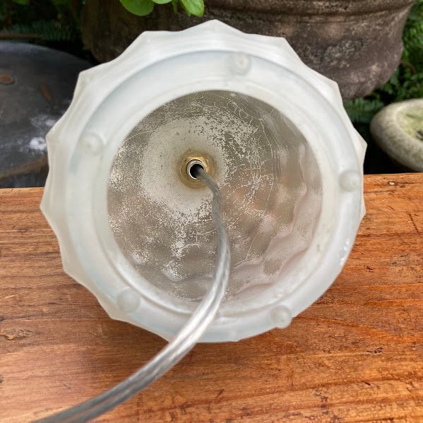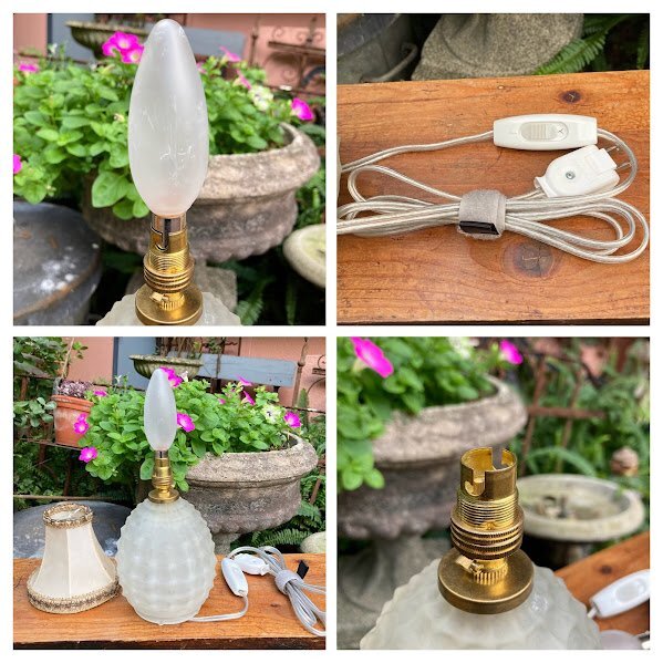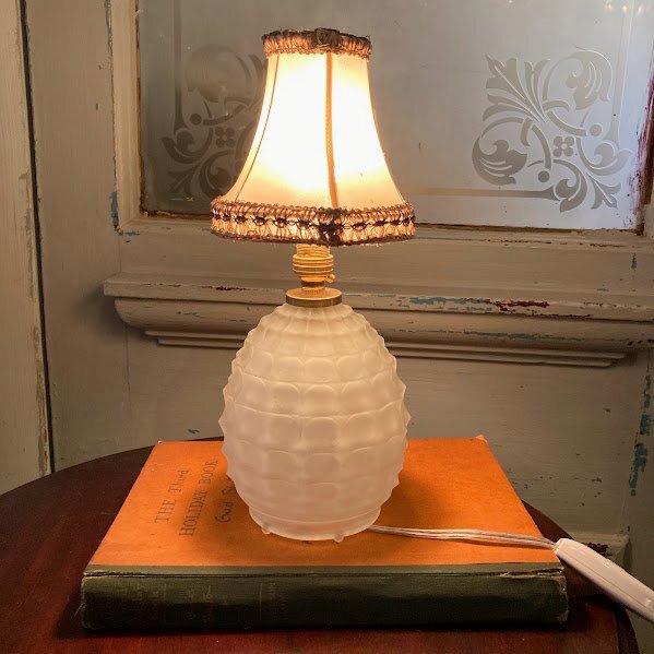 まるで香水瓶のようなフォルムの小さな卓上スタンドが届きました【44-202】小さなシェードが乗った、愛らしい雰囲気を醸しだす照明です。イギリス製、推定1940年代とのこと。電球は海外仕様のB15サイズを使います。コード、スイッチは日本の新しいものと交換済み。本体ガラスの内側や布シェードに小さな傷を含みますが、アンティークの証としてお楽しみください。ベッドサイドやお気に入りのコーナーをほんのり照らす照明をお探し方におすすめ。点灯確認用の電球はシャンデリア球25Wをお付けしていますが、お好きな明るさの電球・形状に交換してご使用ください。福岡市南区の店舗にてお渡しもできますのでお気軽にどうぞ!