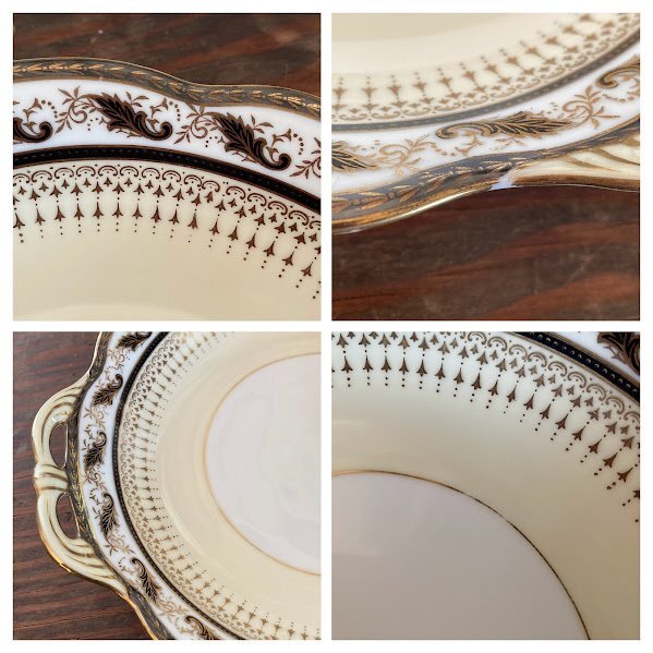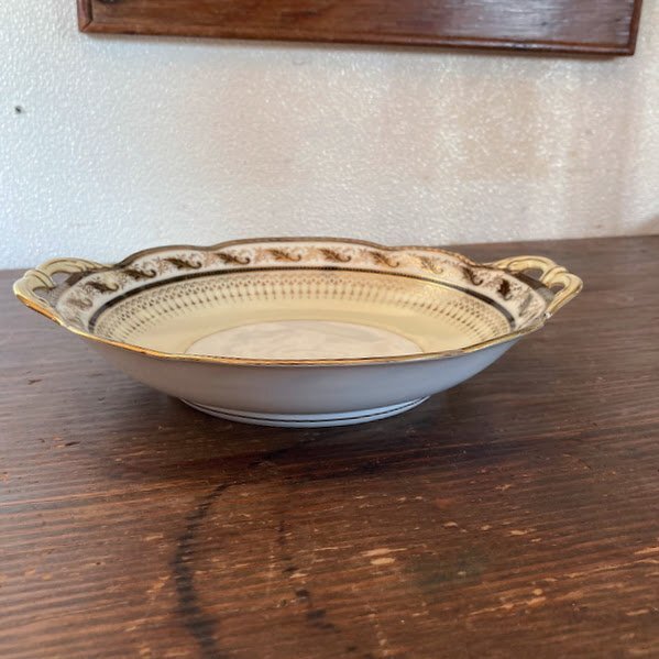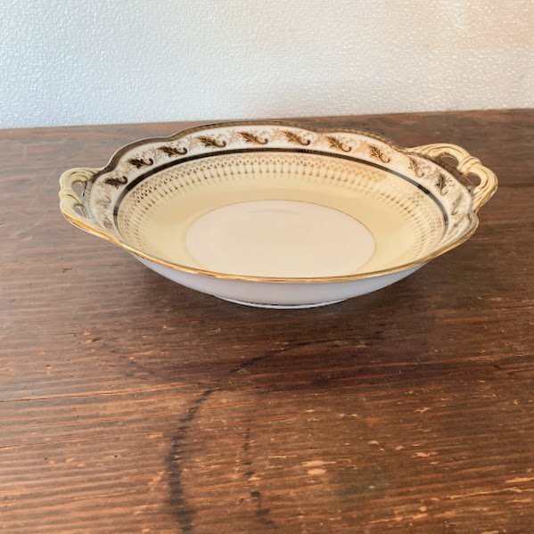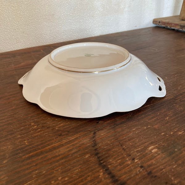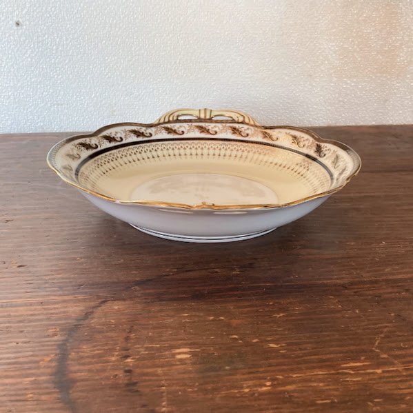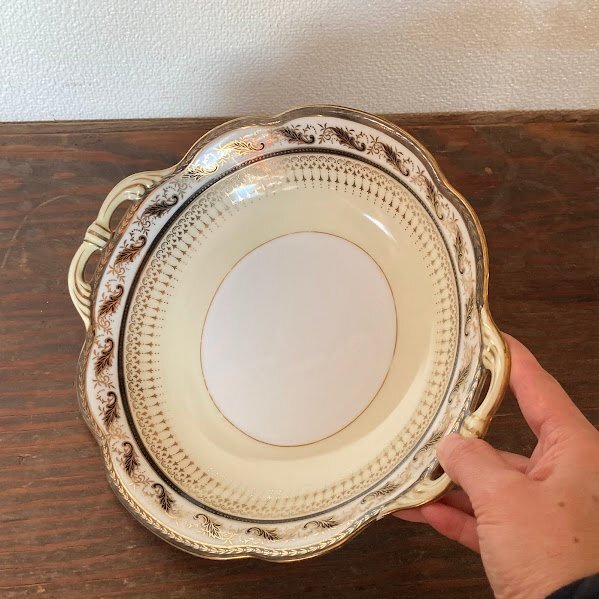 英国から日本へ華やかな金彩に包まれた深皿が戻ってきました【44-217A】バックスタンプから1911年~1941年ごろに英国へ輸出されたもののようです。長い間大切に使われていたようですが、大きなカケもなく比較的きれいな状態ですが、金彩の部分にほんの少し剥がれた部分はあります。アンティークの証としてこれらも含め、時間を共に過ごしてみたい方におすすめ!