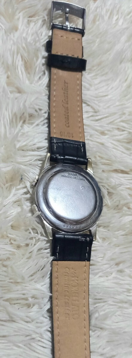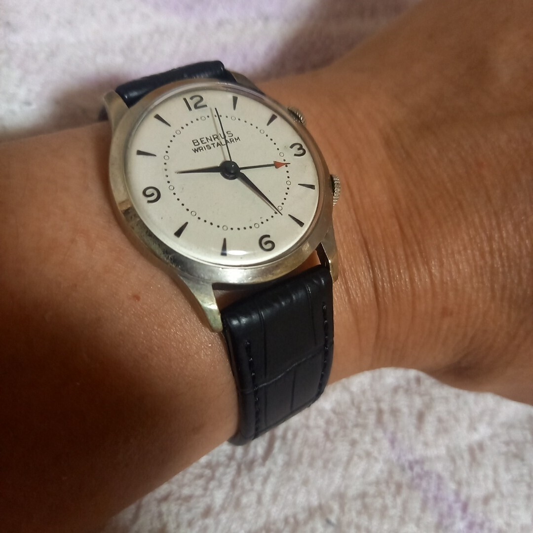 1960年代と思われるベンラス(BENRUS)の、リストアラーム(Wrist Alarm)手巻きです。この時代のアラームは独特で、裏蓋に付いてあるステンレス柱を叩く事によって音を出しています。振動と共にジジジジと音が鳴り響く様は、アンティーク時計ならではの味わいがあります。アラーム操作は、2時位置リューズでアラーム時刻を設定し、リューズを引き上げるとアラームがオンになり、押し込んで通常のリューズ位置になるとオフになります。