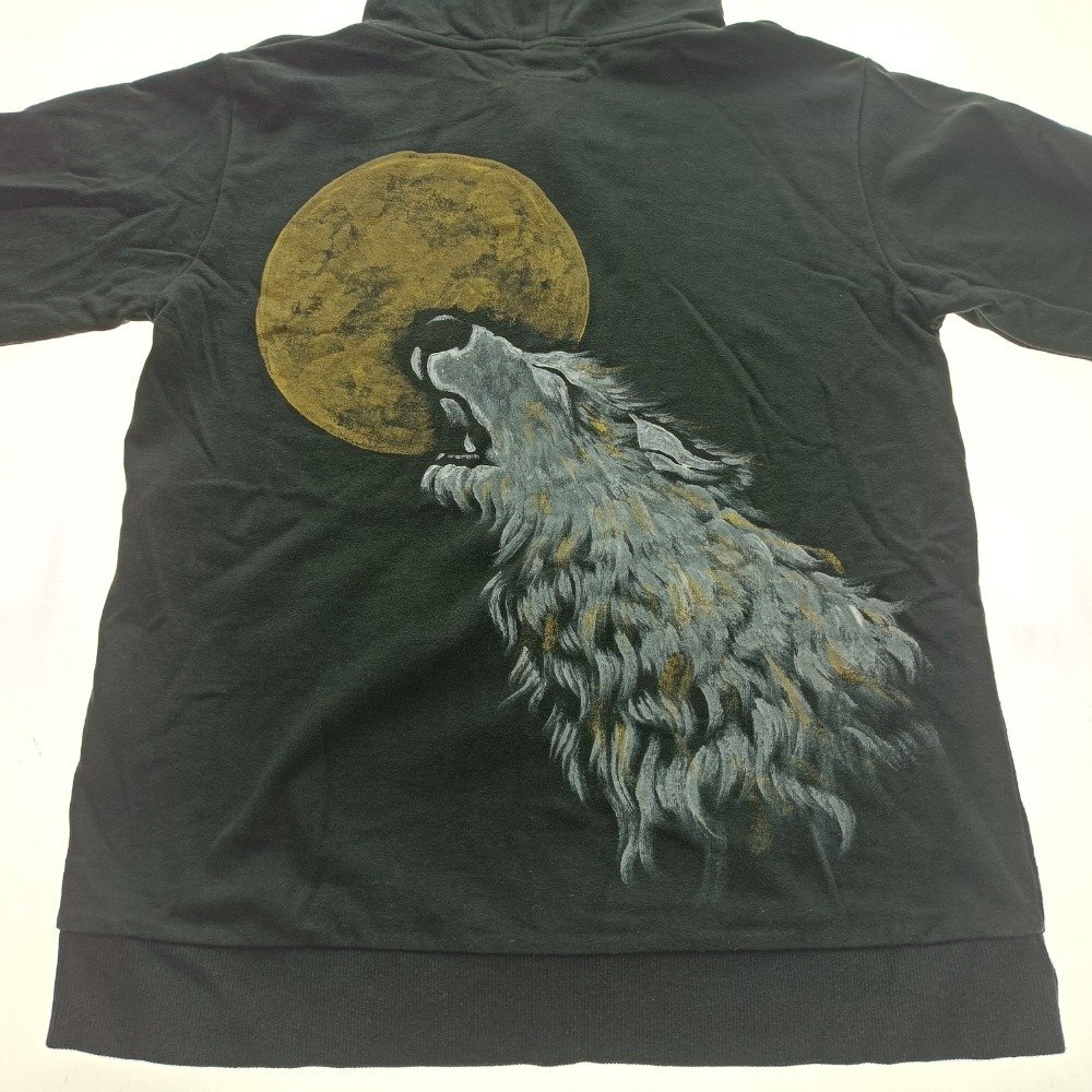 | 禅 ZEN 和柄 ペイント フーディー ジップアップパーカー サイズL 満月 オオカミ 夜 ブラック メンズ カジュアルファッション 中古 |