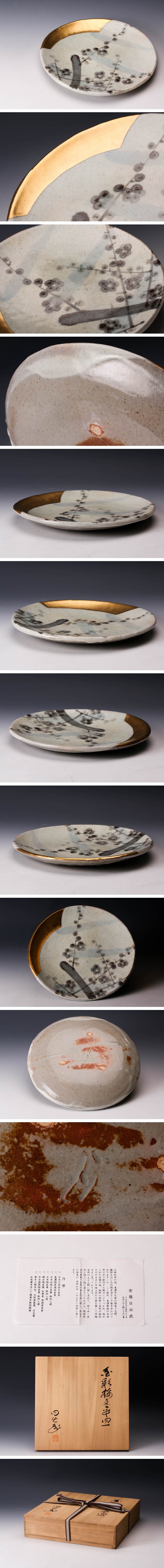 【佳香】安藤日出武 金彩梅文平皿 共箱 栞 本物保証