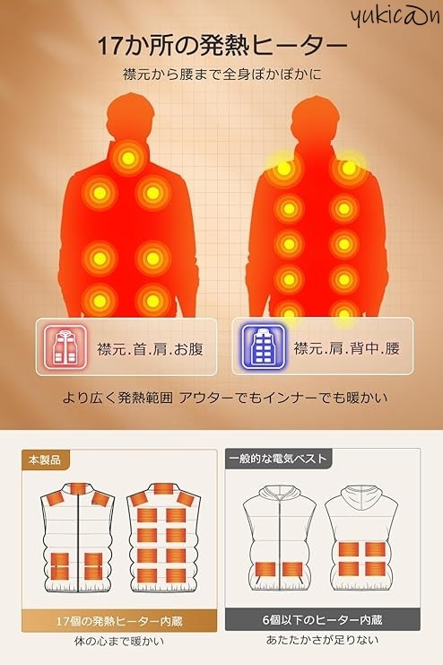 前面に6つ、背面に11つの発熱ポイントを配置し、首元から腰まで全身を包み込むように暖めます。